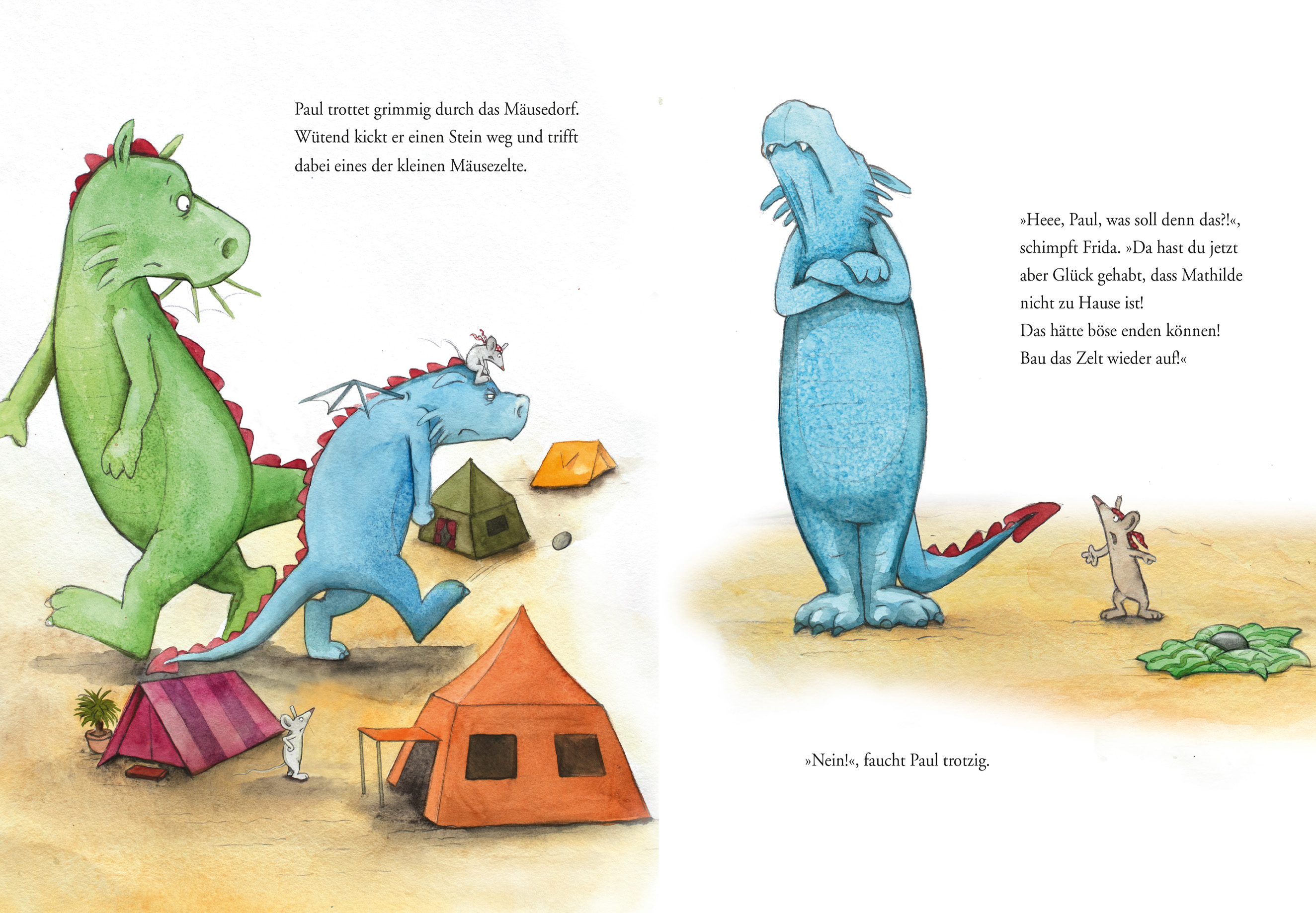 Wut: ein wichtiges Thema in der Familie und im Kindergarten Frida, die Piratenmaus, und Paul, der Wasserdrache, sind beste Freunde. Doch eines Tages steht Paul mit dem linken Fuß zuerst auf. Während er grimmig zur Schule trottet, kickt er einen Stein weg, der ein Mäusezelt umreißt. Als Frida ihn auffordert, es wieder aufzustellen, eskaliert der Streit und Paul schubst Frida um. Die resolute Frida stoppt Paul und zeigt ihm, wie man am besten mit seiner Wut umgeht: Man reagiert sich ab, lässt sie aber niemals an anderen aus. Nachdem Paul sich bei Frida entschuldigt hat, nimmt der Tag sogar noch eine gute Wendung.