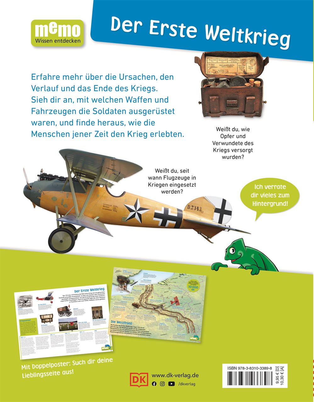 Geschichte zum Entdecken und Staunen! Dieses tolle Sachbuch erklärt Kindern den ersten Weltkrieg - es enthüllt die Veränderungen durch den Kriegsausbruch im Jahre 1914, es betrachtet das Leben der Soldaten und verrät alles über die Einsätze von Luftschiffen. Die beliebte Kindersachbuchreihe memo Wissen entdecken verpackt faszinierendes Wissen für Kinder in kurze, lesefreundliche Texte und viele detailreiche Bilder. Jetzt sogar im frischen, übersichtlichen neuen Layout und mit einem illustrierten Chamäleon-Charakter, der durchs Buch begleitet und beeindruckende Details erklärt oder kommentiert. Dazu gibt's ein beidseitig bedrucktes Poster zum Aufhängen im Kinderzimmer - mit einem spektakulären Foto auf der einen und einer informativen Grafik auf der anderen Seite. Interessante Rubriken wie "Erstaunliche Fakten", "Fragen und Antworten" oder "Neugierig geworden?" vertiefen das erworbene Wissen für Kinder zusätzlich und ein Glossar am Ende des Buches sorgt abschließend noch einmal für einen super Überblick. Das ist großes Wissen in kleinen Häppchen - mit Aha-Erlebnis und Wow-Effekt auf jeder Seite!Umfassende Informationen über die wichtigsten Personen und Orte des ersten Weltkriegs werden in memo Wissen entdecken sachlich kompetent, gleichzeitig leicht verständlich und unterhaltsam vermittelt. Perfekt für junge Leser - als Ergänzung zum Schulunterricht oder für Referate. Dieses Buch ist bei Antolin.de verfügbar.