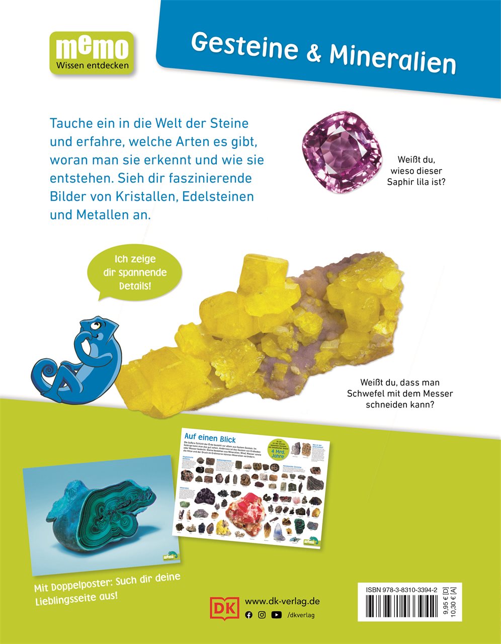 Auf zur Schatzsuche in der Welt der Gesteine und Mineralien! In diesem tollen Sachbuch wird erklärt, wie Gesteine entstehen, welche Eigenschaften Mineralien haben und welch wunderschöne Edelsteine es gibt - inklusive Tipps und Tricks zum Sammeln und Bestimmen von Steinen! Die beliebte Kindersachbuchreihe memo Wissen entdecken verpackt faszinierendes Wissen für Kinder in kurze, lesefreundliche Texte und viele detailreiche Bilder. Jetzt sogar im frischen, übersichtlichen neuen Layout und mit einem illustrierten Chamäleon-Charakter, der durchs Buch begleitet und beeindruckende Details erklärt oder kommentiert. Dazu gibt's ein beidseitig bedrucktes Poster zum Aufhängen im Kinderzimmer - mit einem spektakulären Foto auf der einen und einer informativen Grafik auf der anderen Seite. Interessante Rubriken wie "Erstaunliche Fakten", "Fragen und Antworten" oder "Rekordverdächtig" vertiefen das erworbene Wissen für Kinder zusätzlich und ein Glossar am Ende des Buches sorgt abschließend noch einmal für einen super Überblick. Das ist großes Wissen in kleinen Häppchen - mit Aha-Erlebnis und Wow-Effekt auf jeder Seite!Das Lieblingsthema "Gesteine und Mineralien" wird in memo Wissen entdecken sachlich kompetent, gleichzeitig leicht verständlich und unterhaltsam vermittelt. Perfekt für junge Leser - als Ergänzung zum Schulunterricht oder für Referate. Dieses Buch ist bei Antolin.de verfügbar.