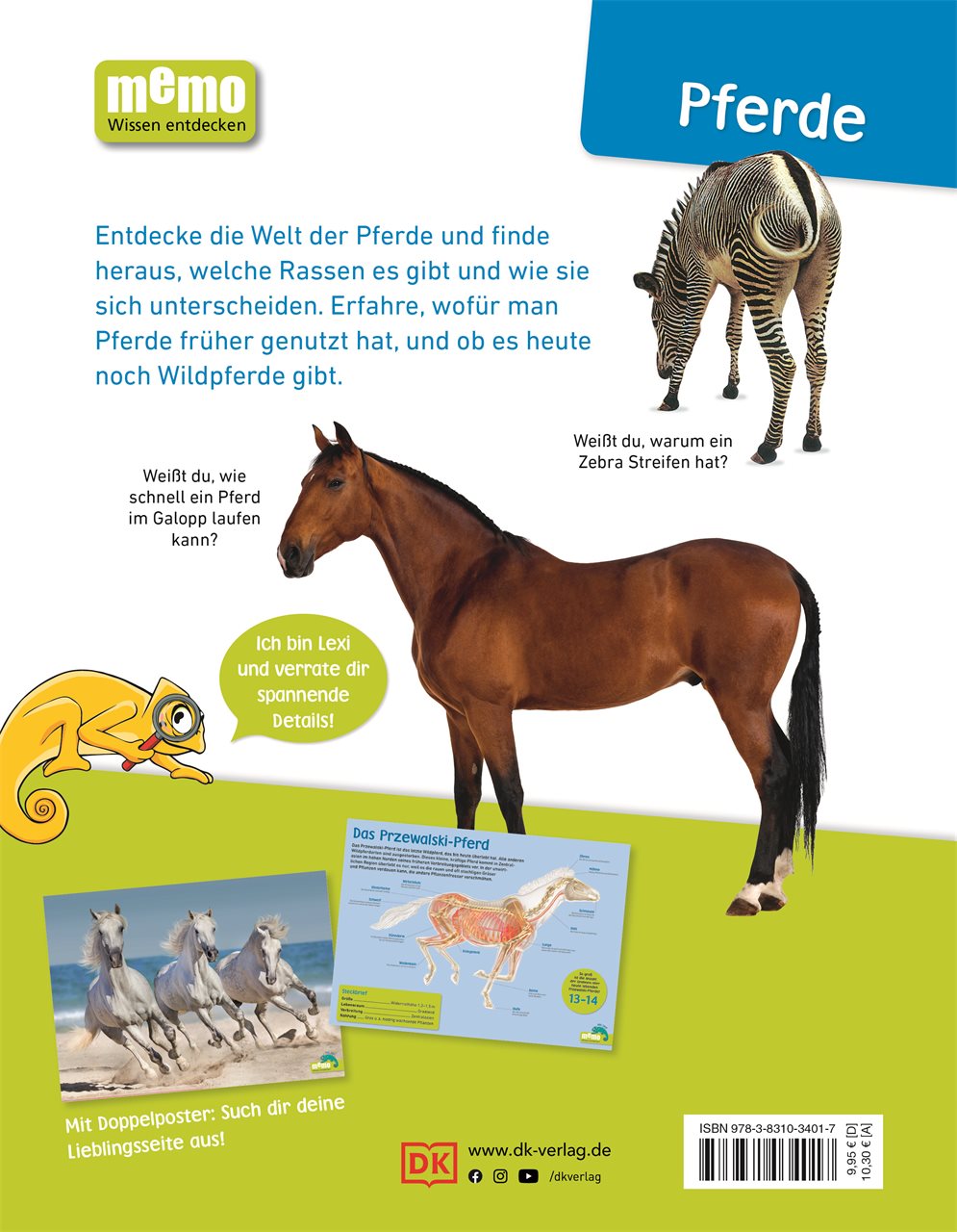 Das große Pferdebuch für Kinder! Auf diesen tollen Seiten steht alles über die Lieblingstiere: Es werden Informationen über ihre Anatomie, ihre Sinne oder ihr Verhalten enthüllt und auf bebilderten Extra-Seiten verschiedene Pferderassen vorgestellt. Die beliebte Kindersachbuchreihe memo Wissen entdecken verpackt faszinierendes Wissen für Kinder in kurze, lesefreundliche Texte und viele detailreiche Bilder. Jetzt sogar im frischen, übersichtlichen neuen Layout und mit einem illustrierten Chamäleon-Charakter, der durchs Buch begleitet und beeindruckende Details erklärt oder kommentiert. Dazu gibt's ein beidseitig bedrucktes Poster zum Aufhängen im Kinderzimmer - mit einem spektakulären Foto auf der einen und einer informativen Grafik auf der anderen Seite. Interessante Rubriken wie "Erstaunliche Fakten", "Fragen und Antworten" oder "Rekordverdächtig" vertiefen das erworbene Wissen für Kinder zusätzlich und ein Glossar am Ende des Buches sorgt abschließend noch einmal für einen super Überblick. Das ist großes Wissen in kleinen Häppchen - mit Aha-Erlebnis und Wow-Effekt auf jeder Seite!In memo Wissen entdecken wird alles über das Lieblingsthema "Pferde" sachlich kompetent, gleichzeitig leicht verständlich und unterhaltsam vermittelt. Perfekt für junge Leser - als Ergänzung zum Schulunterricht oder für Referate. Dieses Buch ist bei Antolin.de verfügbar.
