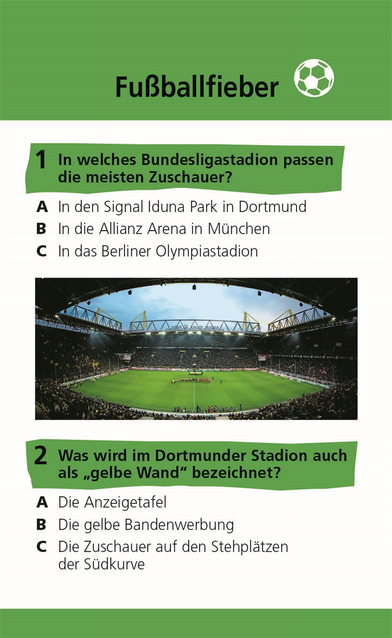 | Schlagworte | 10 Jahre • 6 Jahre • 7 Jahre • 9 Jahre • Ab 8 Jahre • Autofahrt Kinder • Bundesliga • Die Welt des Fußballs • EM 2020 • Fragen und Antworten • für Jungen • für Jungs • für Kinder • Fussball • Fußball • Fußball EM • fußball geschenk • fußball geschenke für jungs • Fußball Kinder • Fußball Kinderbuch • fußball quiz • Fußball-Quiz • Fußball Rätsel • Fußballtricks • Fußball Weltmeisterschaft • fußball wissen • Fußball WM • fußball zubehör • geschenk für fußballfan • Geschenk für Grundschüler • Geschenk Kindergeburtstag Junge • Kinder-Beschäftigung • Kindergeburtstag • Mannschaften • Memo • memo Quiz • Quiz • Quiz Allgemeinwissen • Quizblock • Quizblöcke • Quiz für Kinder • Quiz Kinder • Quiz Spiel • Raten • Rätseln • Rätselspaß • Schultüte Fußball • Schultüte Geschenk • Spiel • Spiele • Sport • Vereine • Wissen |