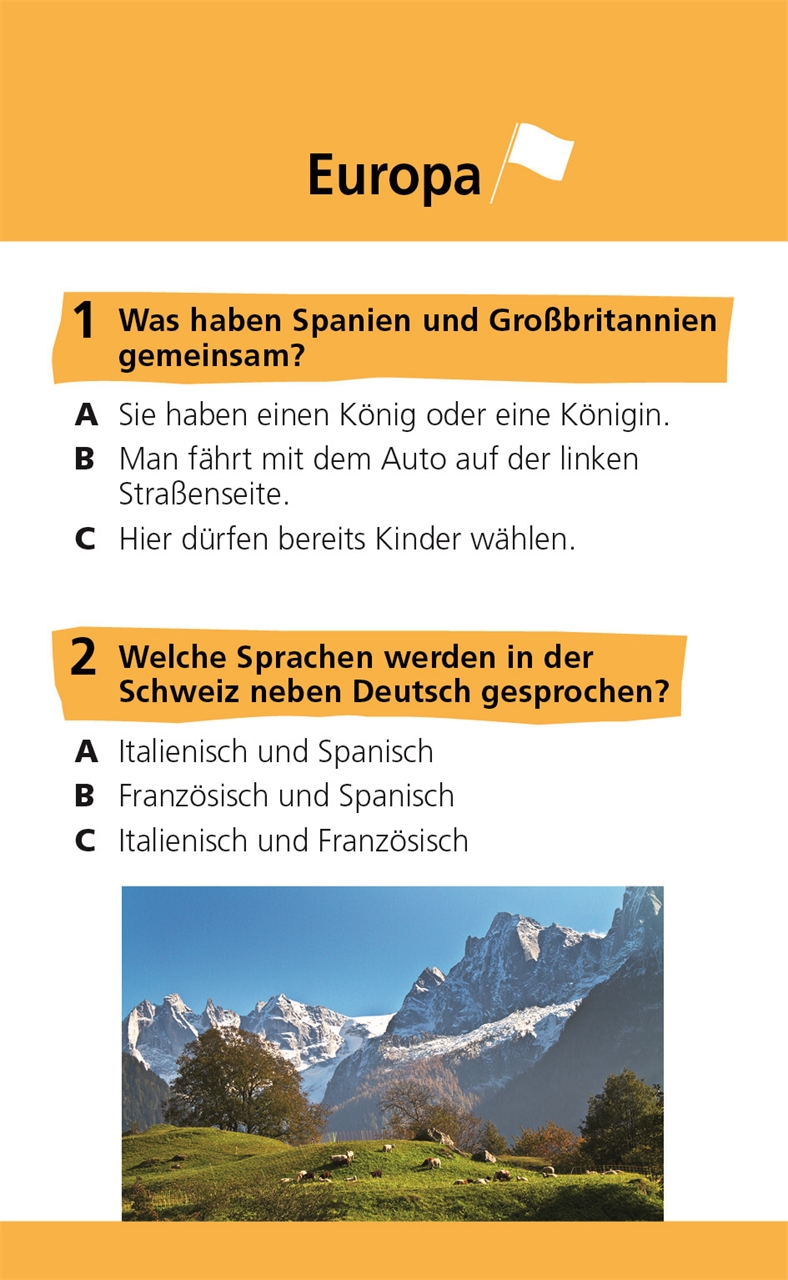 Pro Seite gibt's zwei Quizfragen für Kinder mit drei Antwortmöglichkeiten zur Auswahl. Die richtige Lösung steht auf der Rückseite - gespickt mit interessanten Zusatzinfos und leicht verständlichen Erklärungen. Für echte Durchblicker wird es mit besonders verzwickten Fragen zusätzlich noch etwas schwieriger. Jede richtige Antwort wird natürlich mit Punkten belohnt.