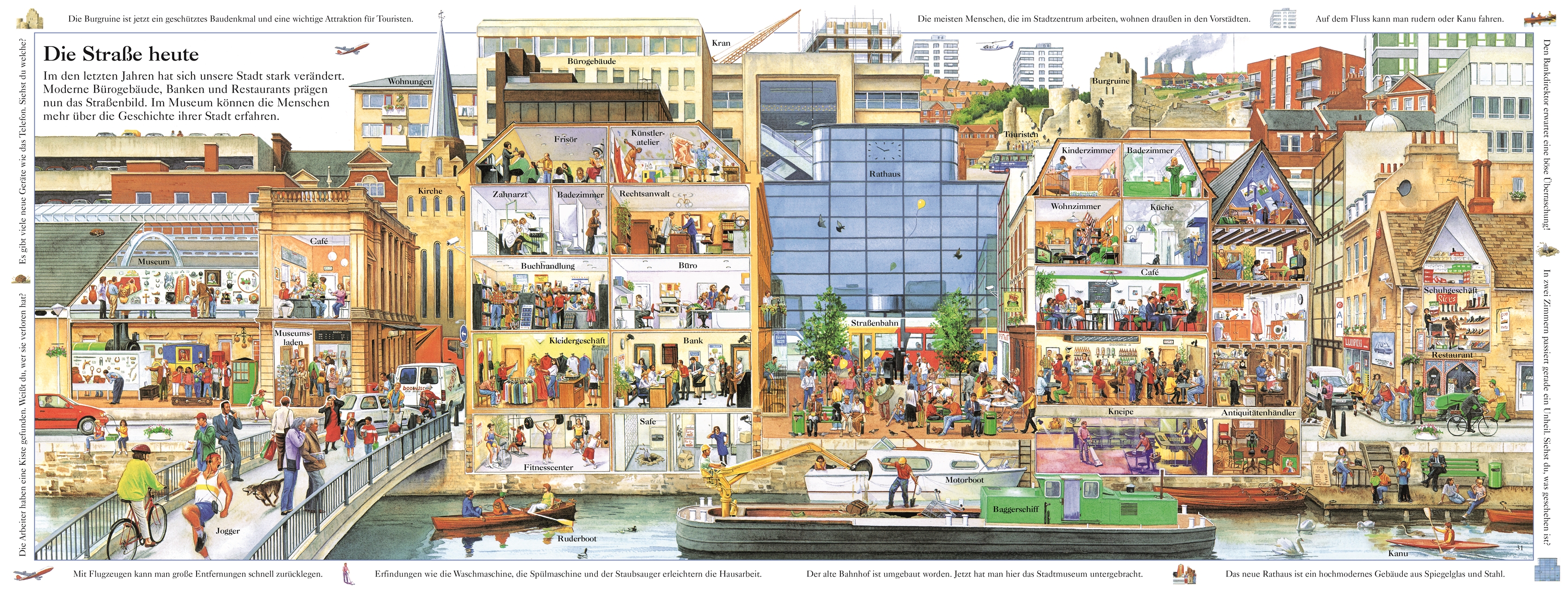 Detailreich illustriert und mit bemerkenswerten Fakten über die Bewohner und ihren Alltag unterstützt, wird das Leben der jeweiligen Epoche greifbar. So erfährt der Leser, welchen Menschen man in jeder Epoche begegnen konnte, welche Berufe sie hatten und welche Regeln und Gesetze galten.