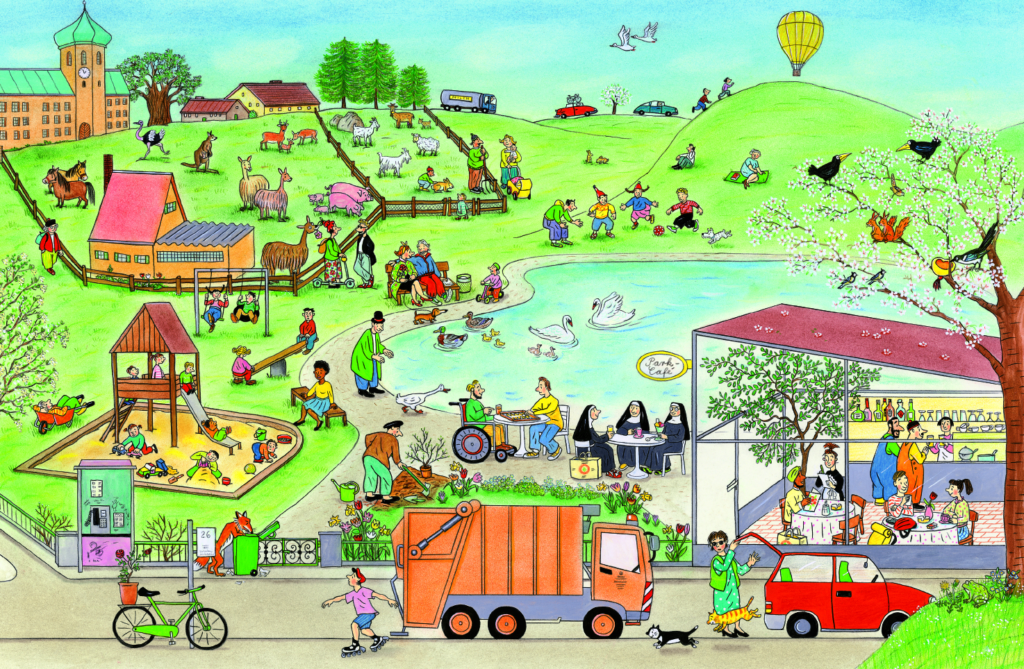 | Schlagworte | Bahnhof • Bauernhof • Bilder • Frühling • Geschichten • Haus • Herbst • Jahreslauf • Jahreszeit • Kaufhaus • Kindergarten • Park • Personen • Sommer • Stadt • Wimmelbuch • Wimmeln • Winter |