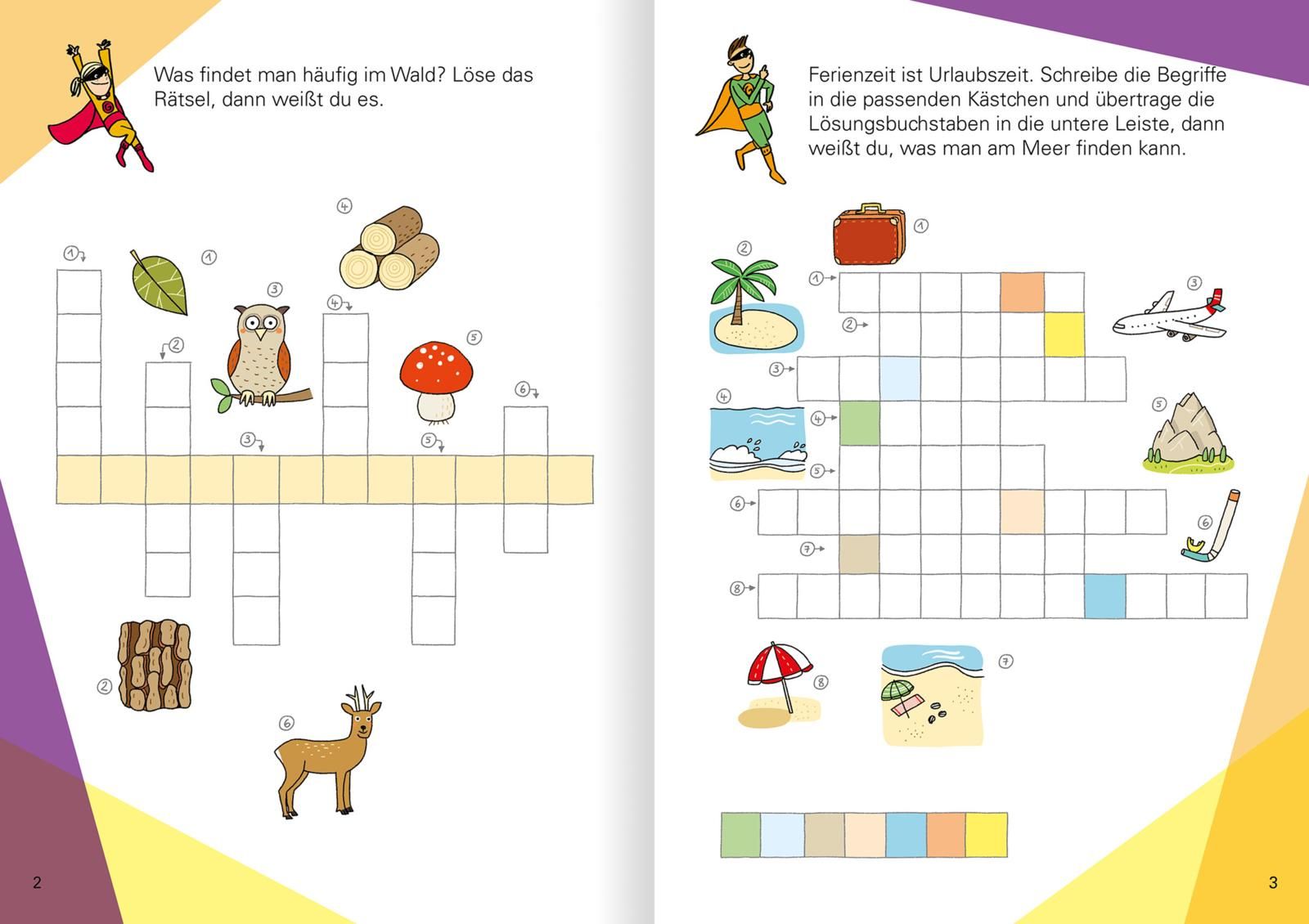 Hier finden sich viele lustige und abwechslungsreiche Kreuzworträtsel für die 1. Klasse. Die spielerischen Aufgaben orientieren sich am Lehrplan und sind mit bunten Illustrationen farbenfroh umgesetzt. Die Kinder trainieren das Schreiben, erweitern ihren Wortschatz und haben Spaß am Lernen. So wird jeder zum superstarken Schulhelden!