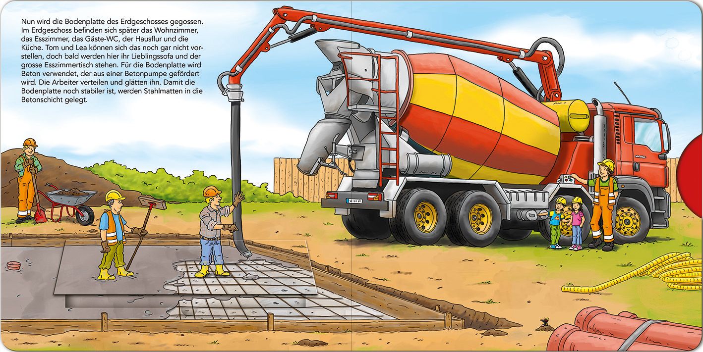 Mia und Jonas sind ganz aufgeregt, denn heute geht es auf die Baustelle - auf ihre Baustelle. Denn hier wird ein Haus für ihre Familie gebaut. Erst muss die Baugrube ausgehoben und ein Fundament gegossen werden. Dann werden die Wände hochgezogen und verputzt und natürlich darf das Dach nicht fehlen.