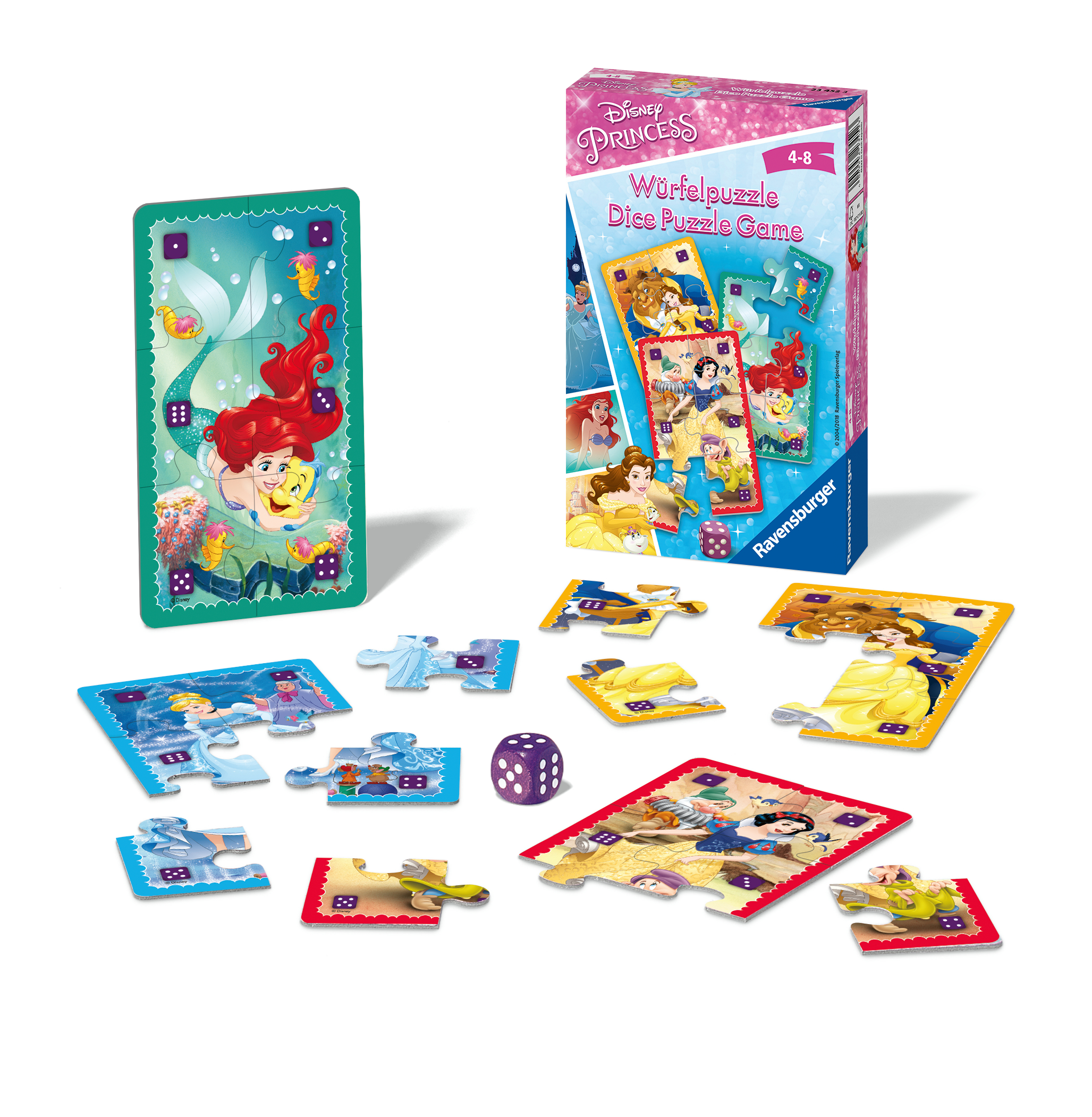 Bei diesem spannenden Sammelspiel puzzeln die Spieler um die Wette ihre Lieblingsprinzessinnen zusammen. Wer am meisten Würfelglück hat, kann das Wettpuzzeln für sich entscheiden! Spiel-Inhalt: 4 Puzzlebilder (6-teilig), 1 Würfel. Spieleranzahl: 2-4. Spieldauer: 10-15 Min. Spieleanleitung in deutsch, niederländisch, spanisch, französisch, italienisch, englisch.