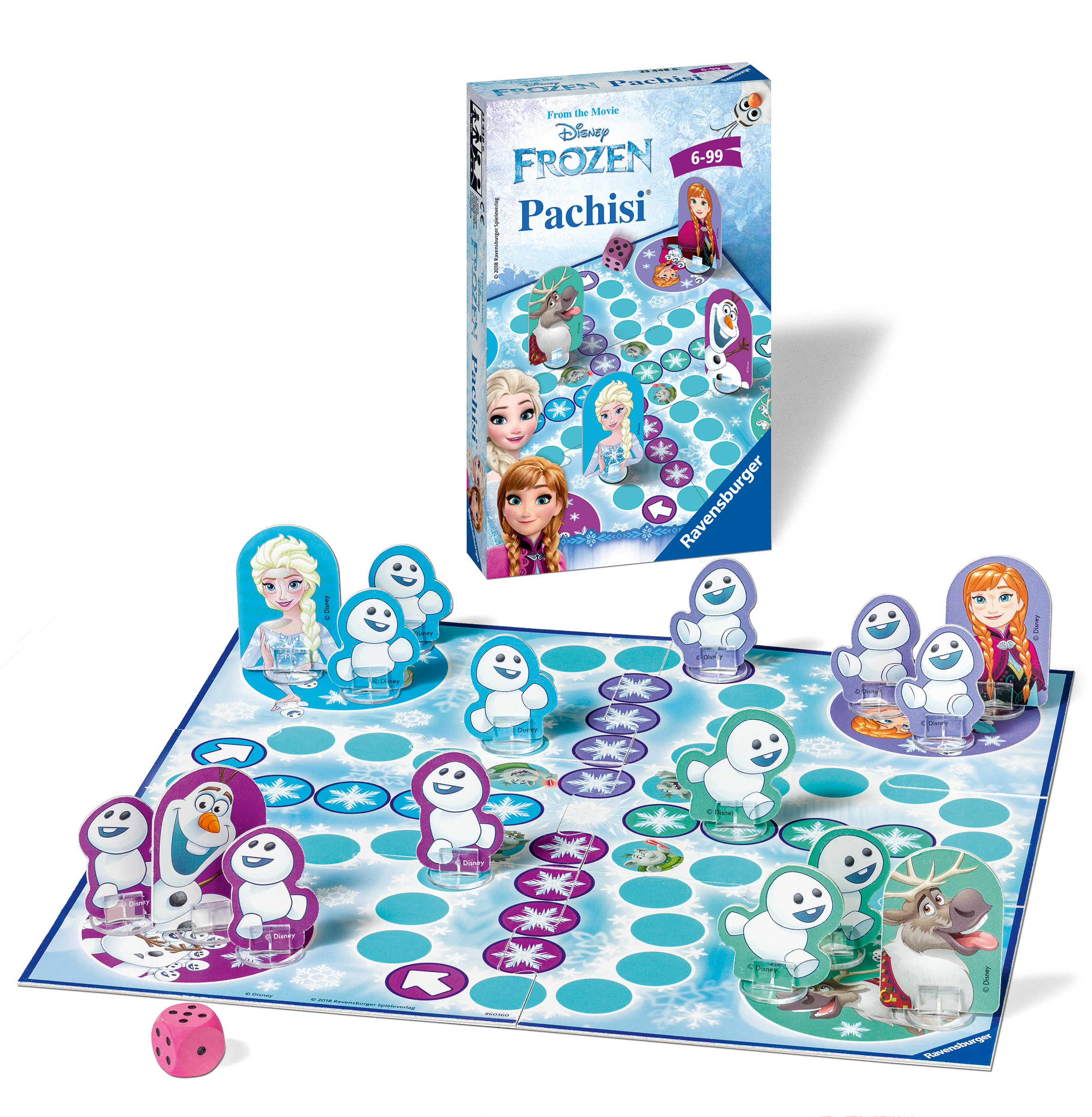 Das bekannte Würfellaufspiel mit den beliebten Figuren Anna, Elsa, Sven und Olaf aus dem Disney-Film "Die Eiskönigin". Wer schafft es als Erster, seine 4 Spielfiguren mit genauer Würfelzahl ins Ziel zu bringen? Jeder will den spannenden Wettlauf für sich entscheiden! Um die Mitspieler am Sieg zu hindern, dürfen sich die Spieler gegenseitig aus dem Rennen werfen oder den Weg versperren. Am Ende wird das Würfelglück entscheiden, wer beim "Frozen Pachisi®" gewinnt. Spiel-Inhalt: 1 Spielplan (aus 6 Teilen), 16 Spielfiguren + Aufsteller, 1 Würfel. Spieleranzahl: 2-4. Spieldauer: 20 Min. Spieleanleitung in deutsch, niederländisch, französisch, italienisch.