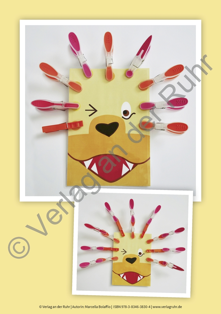 Karteikarten für die Arbeit mit Kita-Kindern sowie für den Anfangsunterricht in der Grundschule und für Eltern +++ Mit diesen kreativen Feinmotorik-Förderkarten geben Sie Kindern von drei bis acht Jahren Spiel, Spaß und Frühförderung buchstäblich selbst in die Hand. Auf jeder Bildkarte ist eine schöne Illustration in fröhlich-bunten Farben zu sehen - doch erst durch das Anbringen von Wäscheklammern an den richtigen Stellen entsteht ein fertiges Bild. Die Kinder knobeln und klemmen, haben jede Menge Spaß und trainieren spielerisch Feinmotorik, Druckdosierung und Auge-Hand-Koordination. Auch Konzentration und Fantasie werden altersgerecht angeregt. Beispielsweise zaubern die Kinder dem Löwen mit Wäscheklammern seine Löwenmähne, dem Kaktus seine Stacheln und dem Eis einen Stiel. Sie selbst müssen sich gar nicht groß dahinterklemmen: Auf der Rückseite jeder Karteikarte ist das jeweilige Motiv zur Selbstkontrolle noch einmal mit fertig angebrachten Wäscheklammern abgebildet. So können sich die Kinder komplett selbstständig mit den Knobelkarten beschäftigen und ihr Ergebnis direkt selbst überprüfen. Die Wäscheklammern zum Vervollständigen besorgen Sie wahlweise in den passenden Farben oder Sie malen gemeinsam mit den Kindern Holzwäscheklammern farbig an. Ob im Kindergarten, im Anfangsunterricht oder auch zu Hause: Die 20 lustigen Wäscheklammer-Bilder garantieren spielerisches Feinmotorik-Training und spannenden Knobelspaß. Ein echter Glücksgriff also, den die Kinder gar nicht mehr aus der Hand geben wollen.