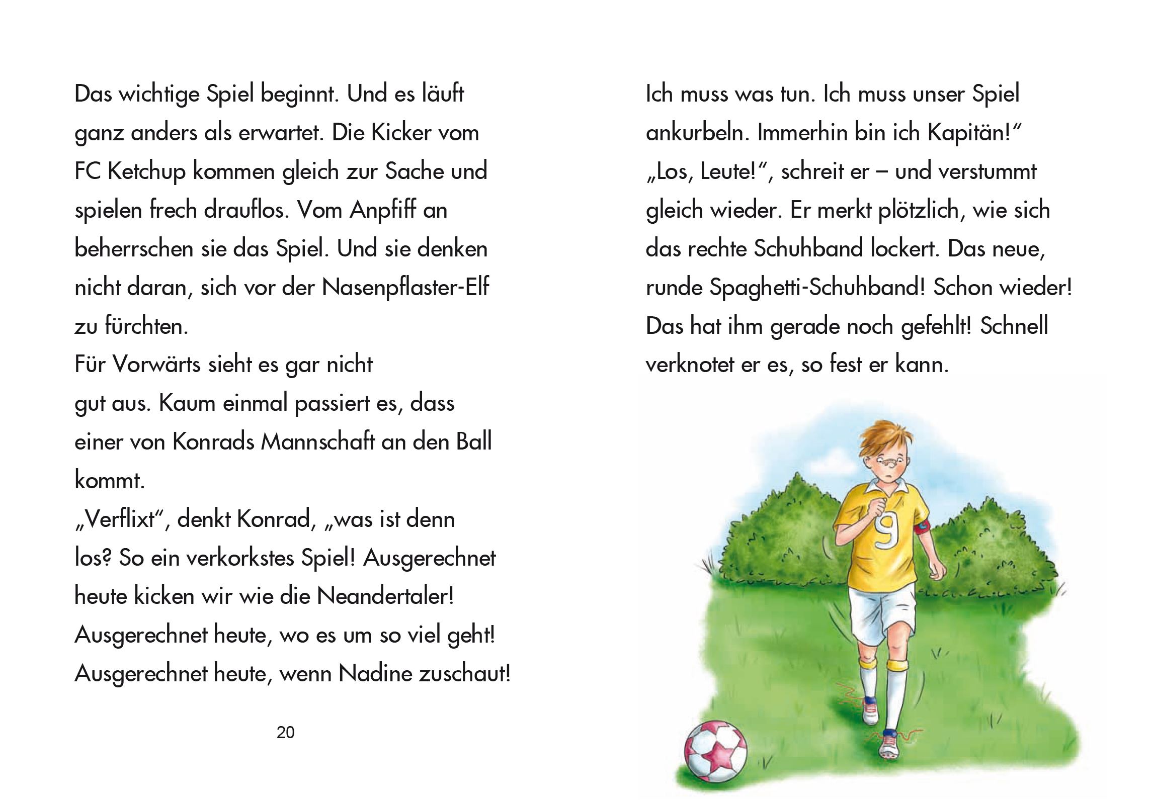 Wenn Konrad eins kann, dann Fußballspielen. Er kann dribbeln, rechts und links schießen und mit dem Ball jonglieren ... Wenn Konrad eins nicht kann, dann Maschen binden. Kein Wunder, dass ihn die Schuhbänder an seinen Fußballschuhen nerven. Besonders im entscheidenden Spiel gegen den FC Ketchup! In Druckschrift geschrieben. Die Texterfassung wird von vierfärbigen Bildern unterstützt.