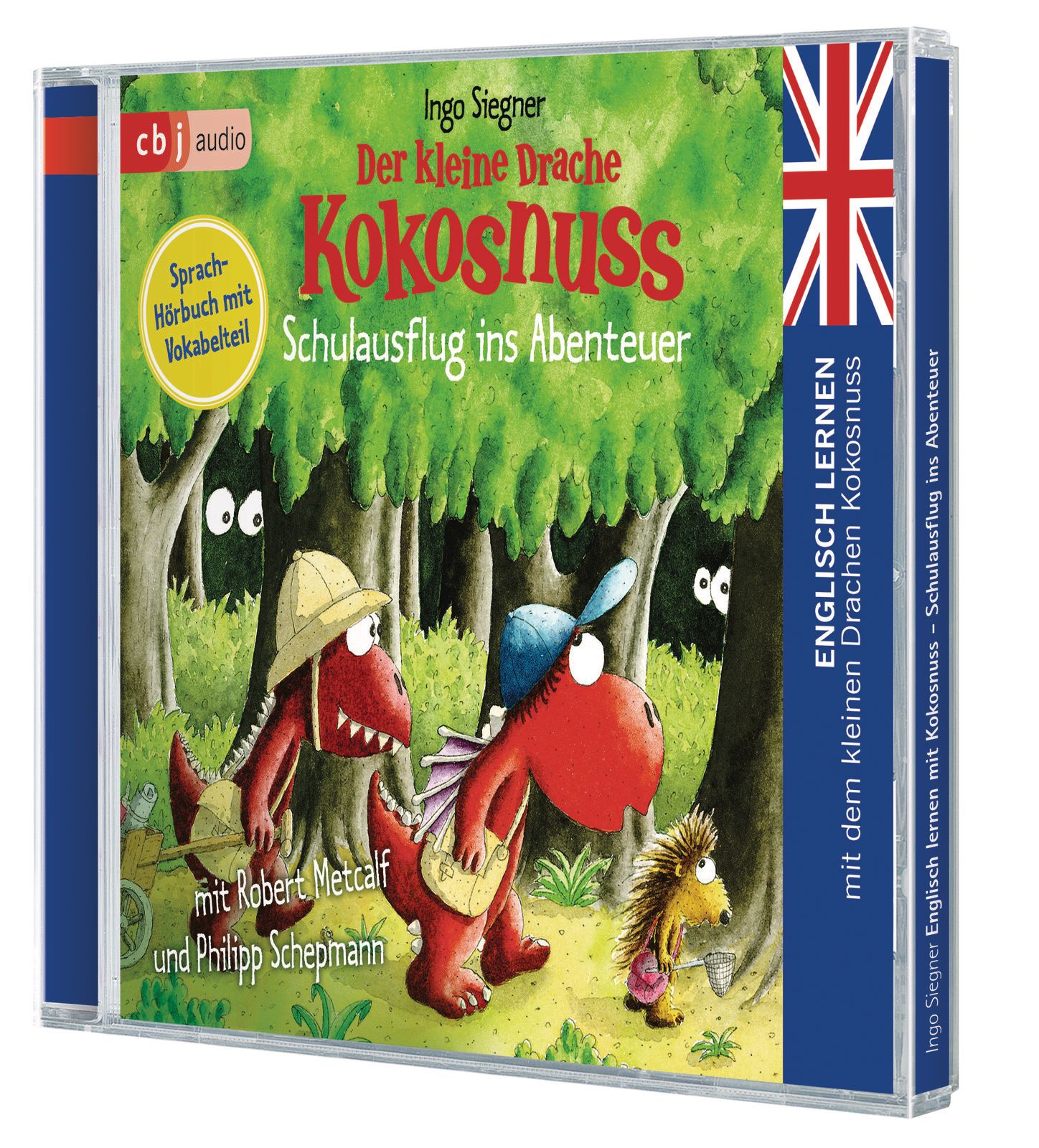 Schulausflug mit Lehrer Bronco Blumenkohl ins Pilz-Tal? Das wird bestimmt langweilig, denkt Kokosnuss. Doch dann kündigt Robert, Kokosnuss' Freund aus Großbritannien, seinen Besuch an. Mit viel Witz und Humor zeigt er den Drachenkindern, was es im Wald alles zu entdecken gibt und welche Namen die Pflanzen und Tiere in seiner Muttersprache haben. Auch die Tages- und Mahlzeiten kennt Kokosnuss schon bald in englischer Sprache.Doch dann warten noch ganz andere Herausforderungen auf den kleinen Sprachschüler: Lehrer Blumenkohl ist zwar ein kluger Biologe, aber von Gefahren wie Treibsand, tiefen Schluchten, Würgeschlangen und unheimlichen Wesen hat er gar keine Ahnung! Ein Glück, dass er mit Kokosnuss, Oskar, Matilda und Robert so erprobte Abenteurer an seiner Seite hat!Gelesen von Kokossnuss-Stimme Philipp Schepmann und Native speaker Robert Metcalf.Das Hörbuch erzählt ein spannendes Kokosnuss-Abenteuer, in das drei Sprach-Lektionen und eine Wiederholungslektion eingebettet sind. In jeder Lektion lernen die kleinen Zuhörer mit der Geschichte und einem kurzen Song eine neue Vokabelgruppe kennen. Der Erzähltext ist in Deutsch gesprochen, so dass auch für Englisch-Anfänger keine Verständnisprobleme bestehen. Zum Nach- und Mitlesen finden Kinder und Eltern im bunten Booklet noch einmal alle Vokabeln und Liedtexte abgedruckt. (1CD, Laufzeit: 1h 16)