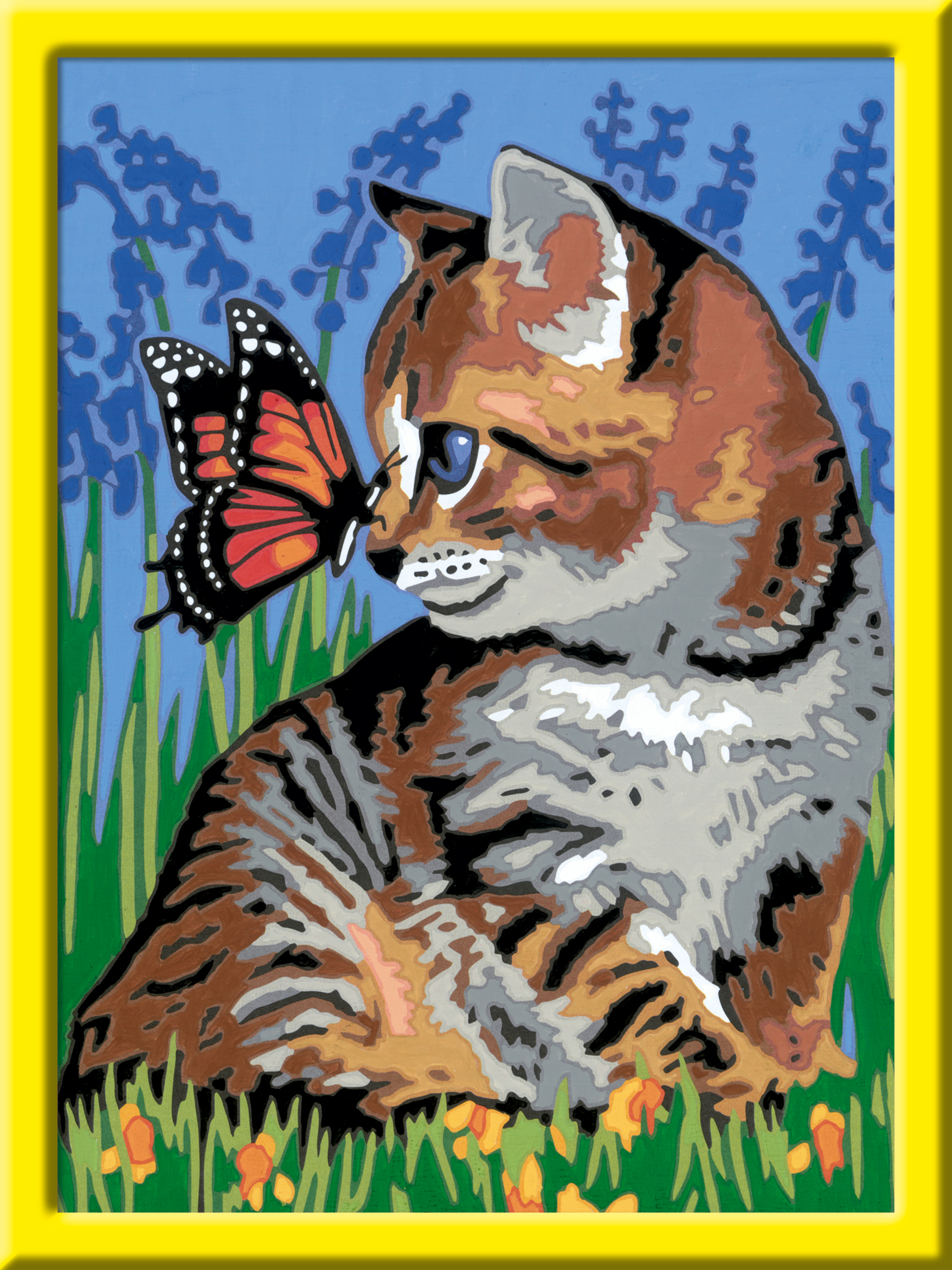 Dank der farbigen Motivlinien, können die Kinder das ganze Motiv Katze mit Schmetterling und die Farben schneller erkennen. Der Pinsel hat eine gute Führung und so entsteht ein perfektes Bild.