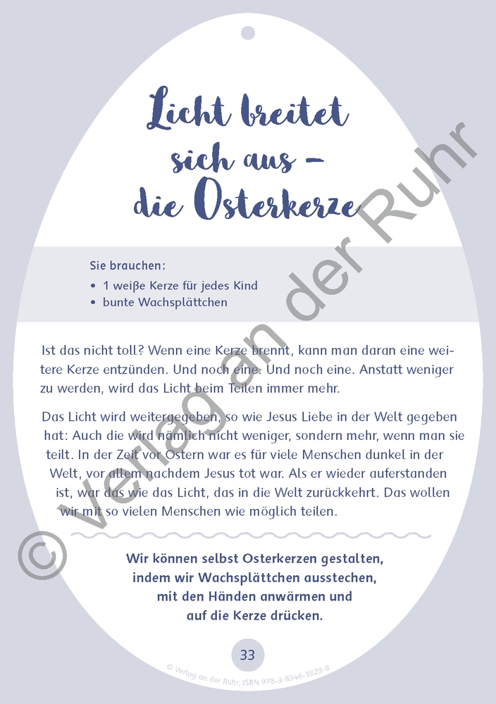 Osterkalender für ErzieherInnen im Kindergarten und für zu Hause +++ Schokoladenhasen schon in der Karwoche verteilen? Oder doch noch Verzicht üben? Den Kindern die Zeit vor Ostern näherzubringen, ist gar nicht so einfach. Für Kinder sind Ostern und die Fastenzeit viel schwieriger greifbar als die Adventszeit - dabei gibt es hier genau so viele schöne Geschichten, Symbole und Bräuche. Mit diesem kindgerechten Osterkalender erhalten Sie Anregungen von Aschermittwoch bis Ostern, die Sie individuell nach Ihrem Geschmack zusammenstellen und als Eltern in der Familie oder als ErzieherIn in der Kita einsetzen können. Die liebevoll gestalteten Ostereier-Karten enthalten Vorlesegeschichten, Bastel- und Spielangebote für drinnen und draußen, Denkanstöße und Lieder und vermitteln unterschiedliche Inhalte der Fasten- und Osterzeit: Verzicht und Trauer, Auferstehung und Frühling sowie Neuanfang und Nächstenliebe. Die Ostergeschichte und weitere biblische Erzählungen kommen hier natürlich auch nicht zu kurz - genauso wie ein Blick über den Tellerrand hin zu anderen Religionen. Alle Angebote sind schnell und mit wenig bis keinem Material in Ihren Alltag zu Hause oder mit der Kindergruppe zu integrieren. In einem praktischen Begleitheft erhalten Sie Ideen für den Einsatz der Karten und zusätzliche Kopiervorlagen. Hängen Sie für jeden Tag eine der schönen Karten auf und erleben Sie die Fastenzeit mit den Kindern ganz bewusst. Mit jedem Osterei wird die Wartezeit verkürzt und die Vorfreude auf Ostern wächst!
