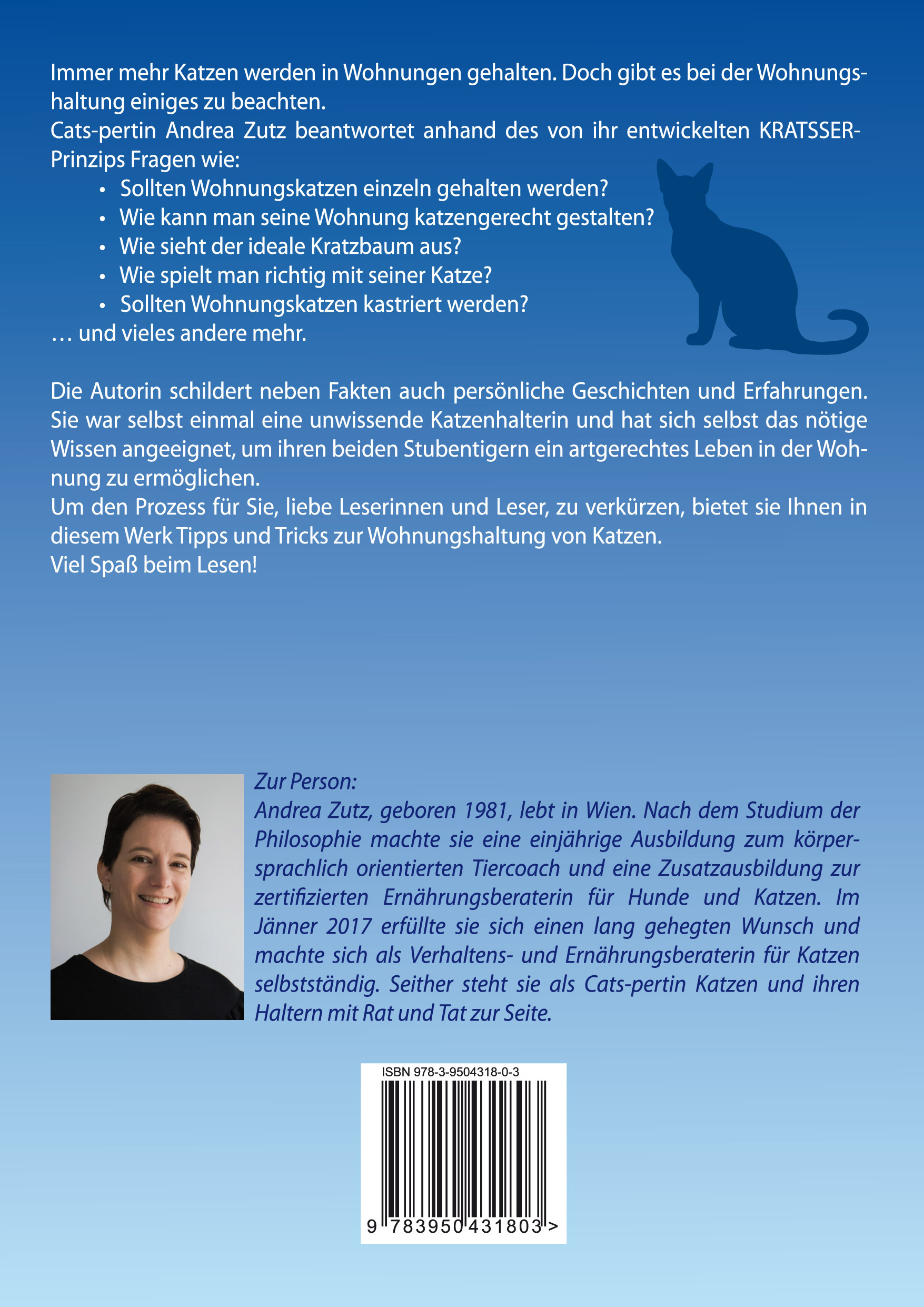 Immer mehr Katzen werden in Wohnungen gehalten. Doch gibt es bei der Wohnungshaltung einiges zu beachten.Cats-pertin Andrea Zutz beantwortet anhand des von ihr entwickelten KRATSSER-Prinzips Fragen wie:Sollten Wohnungskatzen einzeln gehalten werden?Wie kann man seine Wohnung katzengerecht gestalten?Wie sieht der ideale Kratzbaum aus?Wie spielt man richtig mit seiner Katze?Sollten Wohnungskatzen kastriert werden?... und vieles andere mehr.Die Autorin schildert neben Fakten auch persönliche Geschichten und Erfahrungen. Sie war selbst einmal eine unwissende Katzenhalterin und hat sich selbst das nötige Wissen angeeignet, um ihren beiden Stubentigern ein artgerechtes Leben in der Wohnung zu ermöglichen.Um den Prozess für Sie, liebe Leserinnen und Leser, zu verkürzen, bietet sie Ihnen in diesem Werk Tipps und Tricks zur Wohnungshaltung von Katzen.Viel Spaß beim Lesen!