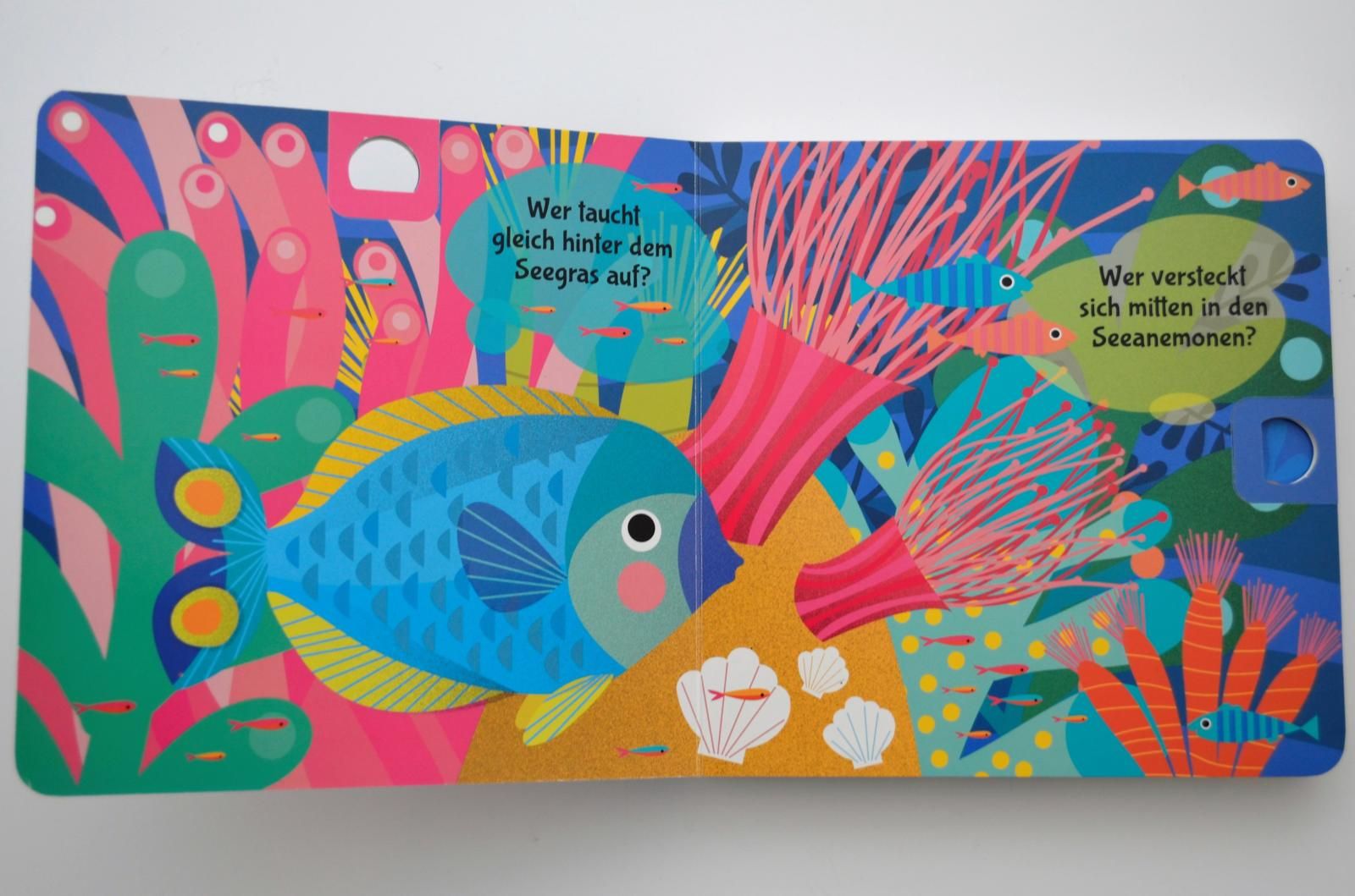 Viele Meeresbewohner können kleine Tierfreunde hier entdecken: Da ist das lustige Seepferdchen und der bunte Clownfisch, dort spielen die niedlichen Seehunde und taucht die Walfamilie. Und wer kommt zum Vorschein, wenn die großen Zieh-Seiten nach oben, nach unten, nach rechts und nach links herausgezogen werden?