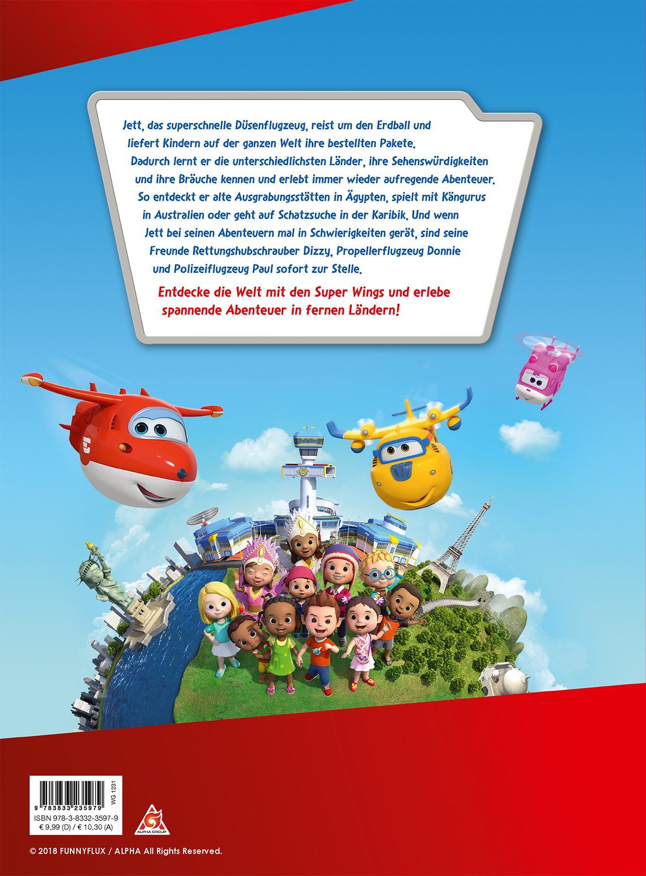 Jett, das superschnelle Düsenflugzeug, reist um den Erdball und liefert Kindern auf der ganzen Welt ihre bestellten Pakete. Dadurch lernt er die unterschiedlichsten Länder, ihre Sehenswürdigkeiten und ihre Bräuche kennen und erlebt immer wieder aufregende Abenteuer. So entdeckt er unter anderem alte Ausgrabungsstätten in Ägypten, spielt mit Kängurus in Australien oder geht auf Schatzsuche in der Karibik. Und wenn Jett bei seinen Abenteuern mal in Schwierigkeiten gerät, sind seine Freunde Rettungshubschrauber Dizzy, Propellerflugzeug Donnie und Polizeiflugzeug Paul sofort zur Stelle.Entdecke die Welt mit den Super Wings und erlebe spannende Abenteuer in fernen Ländern!