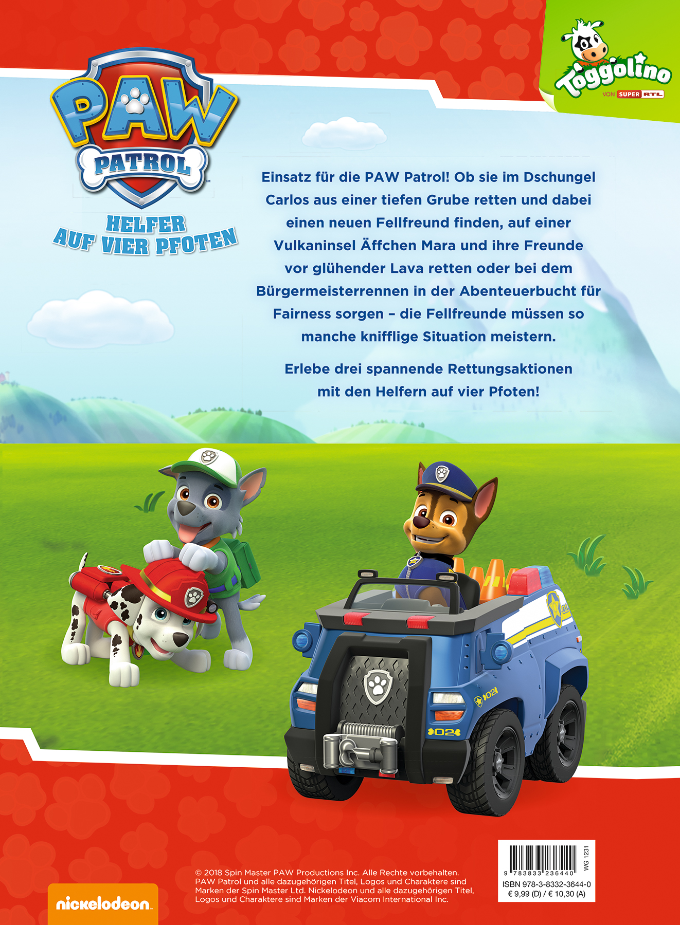 | Schlagworte | Abenteuerbucht • Adventure Bay • Äffchen • Carlos • Chase • Everest • Fellfreunde • Feuerwehrhund • Geschichtensammlung • Geschichtenschatz • Helfer auf 4 Pfoten • Hunde • Hundegeschichten • Mara • Marshall • Nickelodeon • Paw Patrol • PAW Patrol Geschichtensammlung • Polizeihund • Rettungsaktionen • Rocky • Rubble • Ryder • Skye • Super RTL • Teamwork • Tiergeschichten • Toggolino • Tracker • TV-Serie • Vorlesen • Zuma |