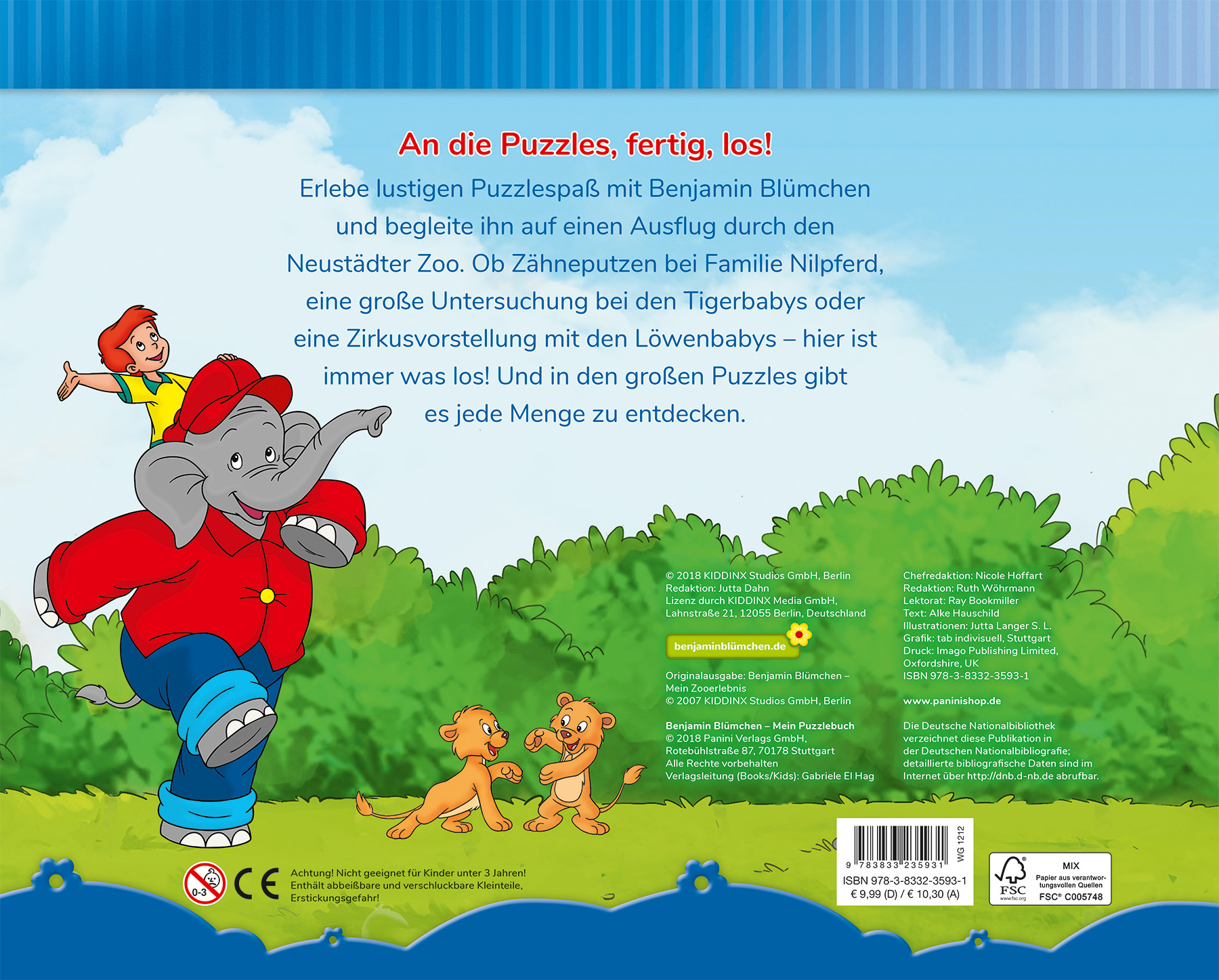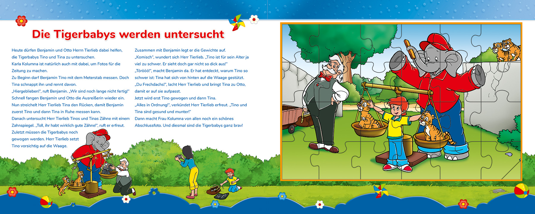 An die Puzzles, fertig, los!Erlebe lustigen Puzzlespaß mit Benjamin Blümchen und begleite ihn auf einen Ausflug durch den Neustädter Zoo. Ob Zähneputzen bei Familie Nilpferd, eine große Untersuchung bei den Tigerbabys oder eine Zirkusvorstellung mit den Löwenbabys - hier ist immer was los! Und in den großen Puzzles gibt es jede Menge zu entdecken.