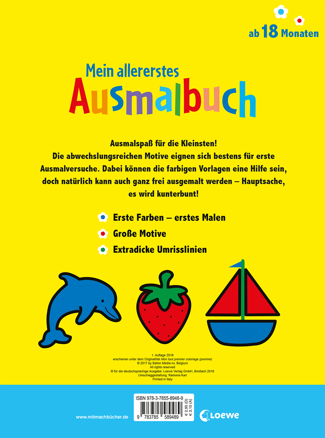 Die großen und abwechslungsreichen Motive mit extradicken Umrisslinien eignen sich perfekt für erste Ausmalversuche der Kinder. Das Ausmalbuch verspricht kunterbunten Malspaß für die Kleinsten ab 18 Monaten!
