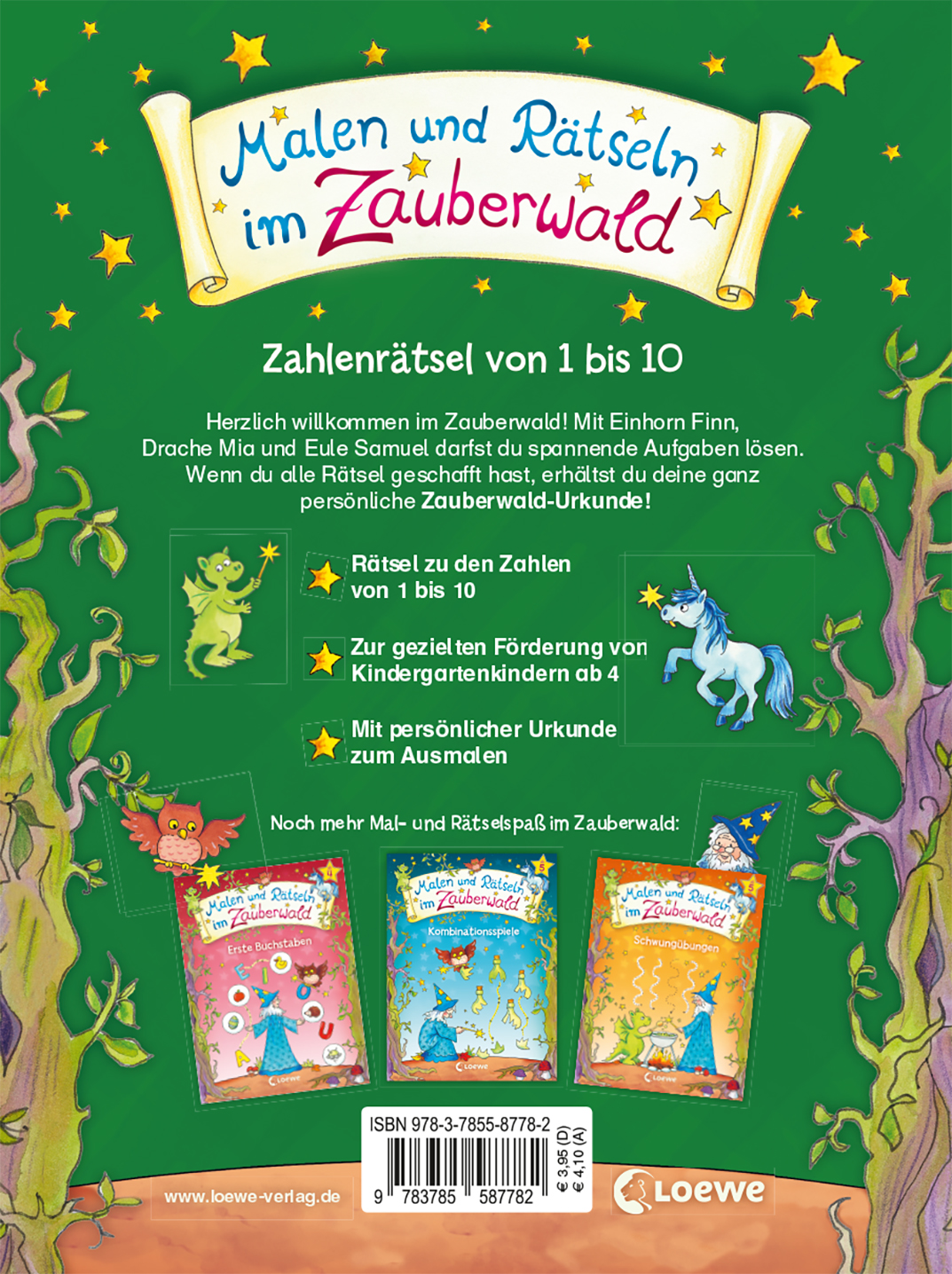 Zusammen mit vier magischen Freunden gehen Kindergartenkinder auf Entdeckungsreise durch abwechslungsreiche Rätsel rund um das Thema Zahlen und Mathe. Die altersgerechten Übungen zum Zählen, Malen und Suchen führen sie behutsam an die ersten Zahlen heran und schulen gleichzeitig Konzentration und logisches Denken. Am Ende wartet eine eigene Zauberwald-Urkunde, die die Kinder mit jeder gelösten Übung nach und nach kolorieren dürfen.