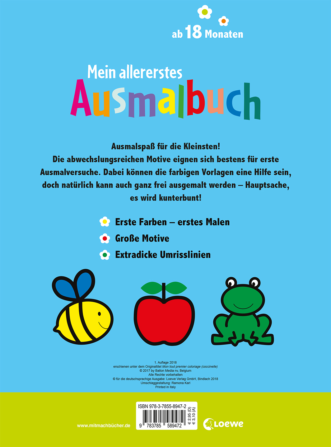 Die großen und abwechslungsreichen Motive mit extradicken Umrisslinien eignen sich perfekt für erste Ausmalversuche der Kinder. Das Ausmalbuch verspricht kunterbunten Malspaß für die Kleinsten ab 18 Monaten!