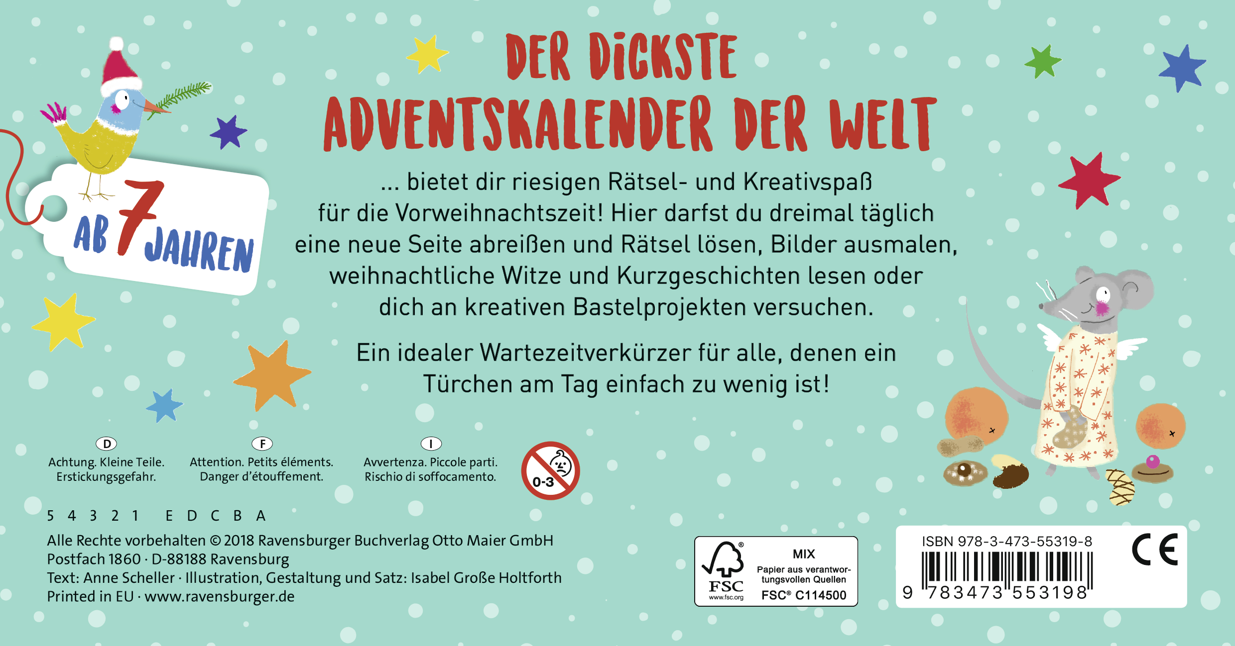 Dieser Adventskalender der etwas anderen Art bietet für jeden Tag der Adventszeit gleich mehrmals Spaß: Dreimal täglich dürfen Kinder hier eine neue Seite abreißen und Rätsel lösen, Bilder ausmalen, weihnachtliche Witze und Kurzgeschichten lesen oder sich an kreativen Bastelprojekten versuchen. Der ideale Wartezeitverkürzer für alle, denen ein Türchen am Tag einfach zu wenig ist.