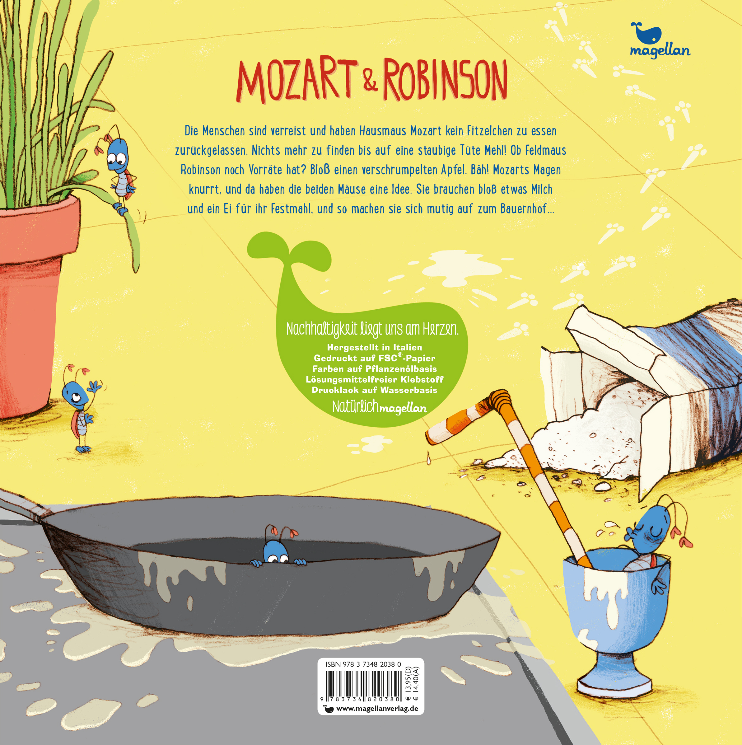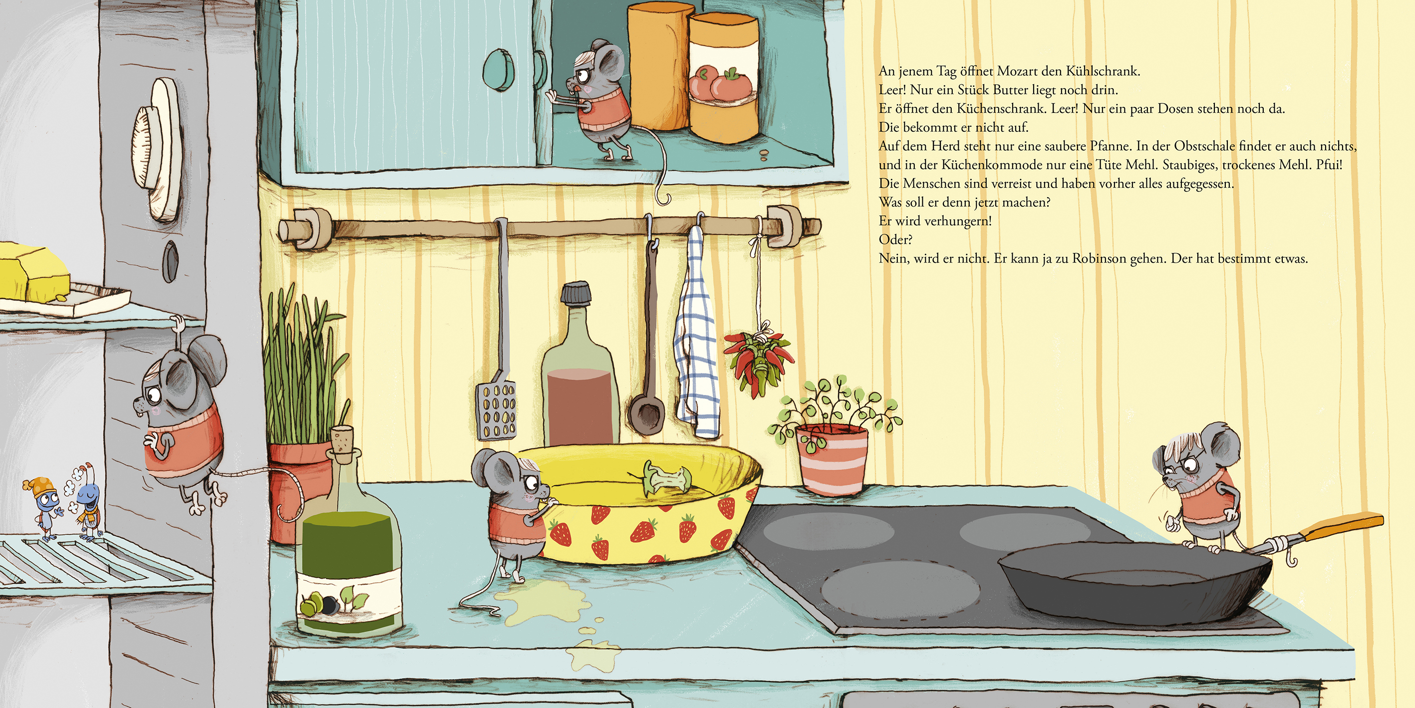 Die Menschen sind verreist und haben Hausmaus Mozart kein Fitzelchen zu essen zurückgelassen. Nichts mehr zu finden, bis auf eine staubige Tüte Mehl! Ob Feldmaus Robinson noch Vorräte hat? Bloß einen verschrumpelten Apfel! Bäh! Mozarts Magen knurrt, doch zum Glück haben die beiden Mäuse eine Idee. Sie brauchen bloß etwas Milch und ein Ei für ihr Pfannkuchen-Festmahl und machen sich mutig auf zum Bauernhof ...