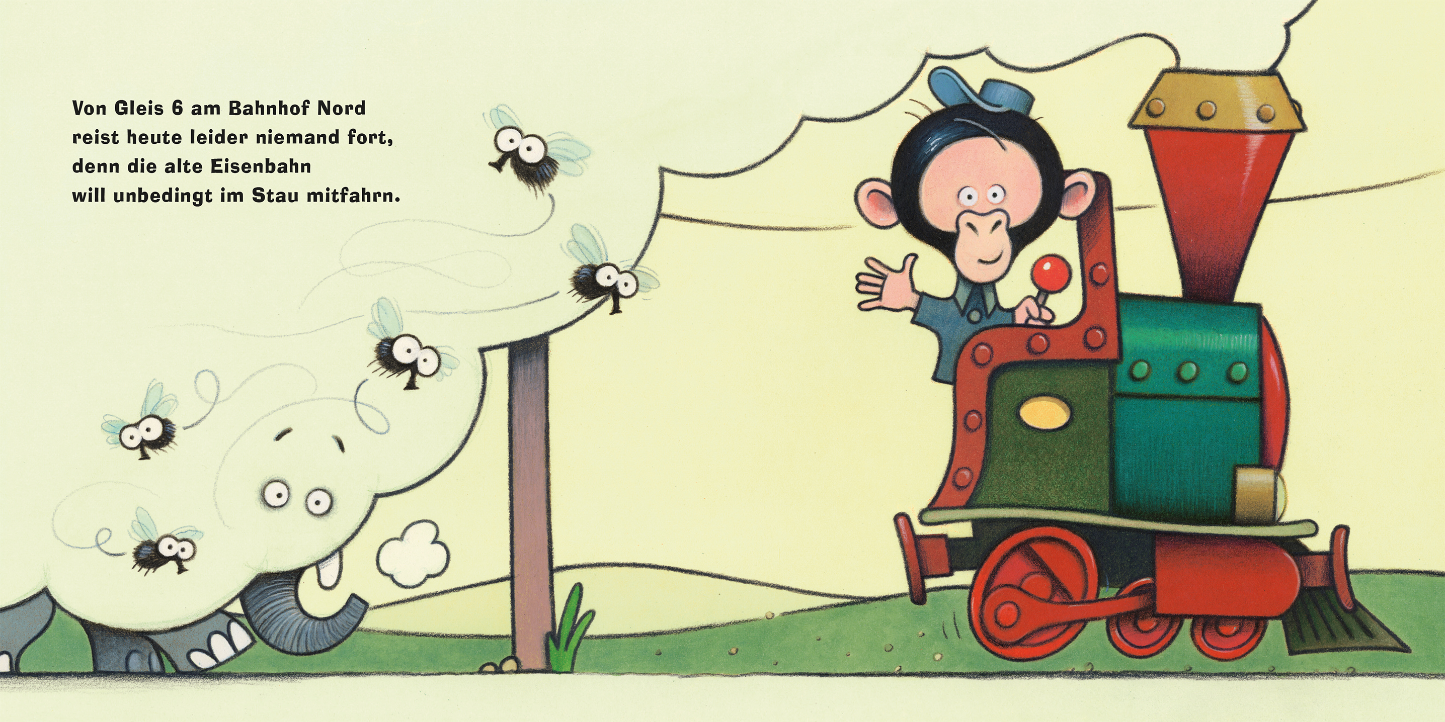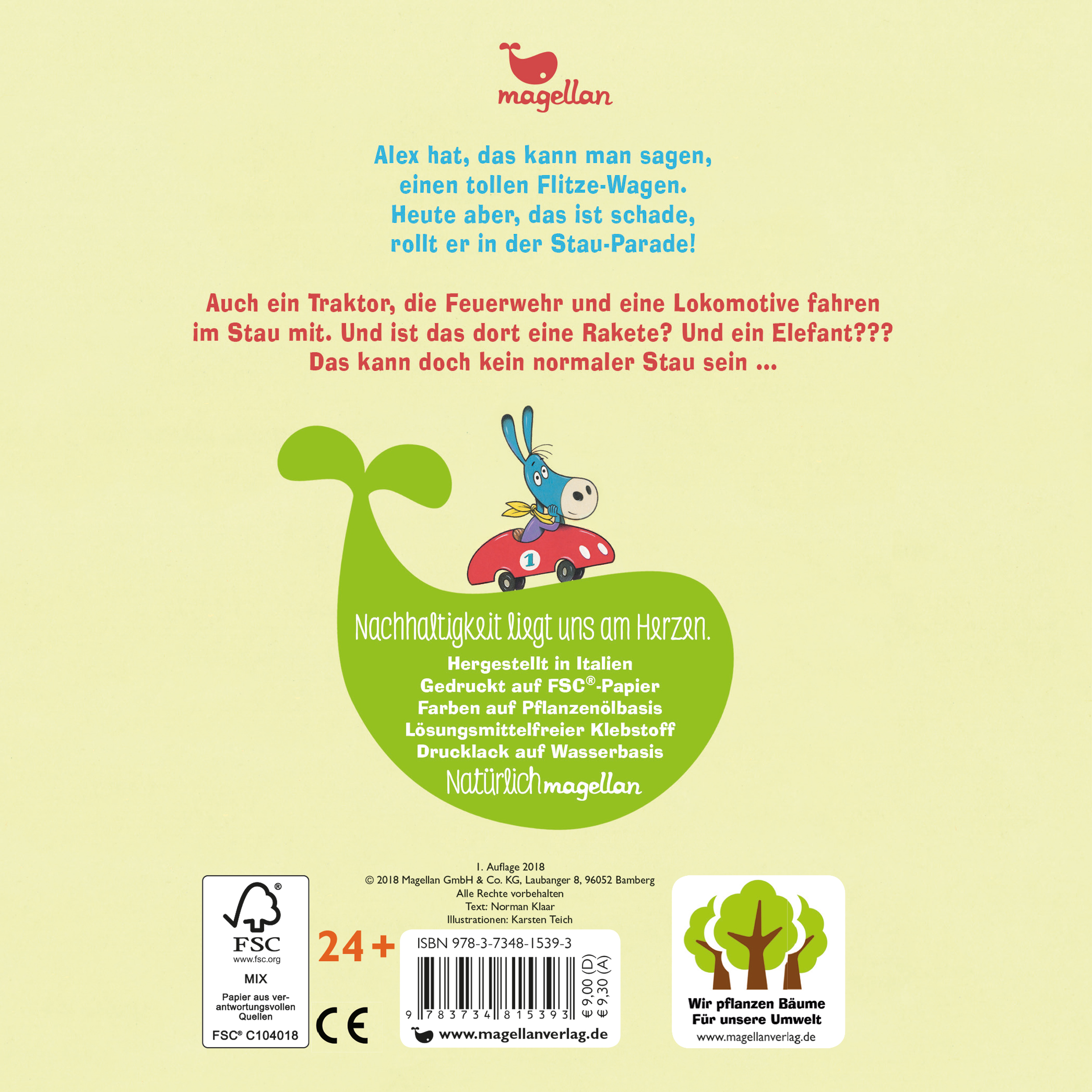 Alex hat, das kann man sagen, einen tollen Flitze-Wagen. Heute aber, das ist schade, rollt er in der Stau-Parade! Auch ein Abschleppwagen, die Feuerwehr und eine Lokomotive fahren im Stau mit. Und ist das dort eine Rakete? Und ein Elefant??? Das kann doch kein normaler Stau sein ...