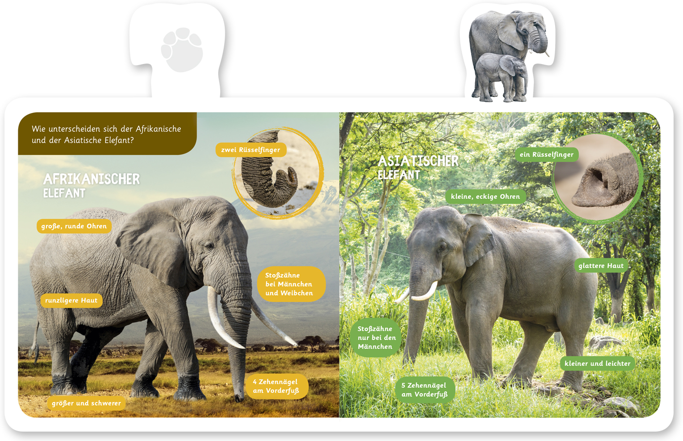 Wozu benutzen Elefanten ihren Rüssel? In welchen Gemeinschaften ziehen sie durch die Savanne? Wie unterscheiden sich eigentlich der Afrikanische und der Asiatische Elefant? Knappe, informative Texte lassen die kleinen und großen Leser teilhaben am Leben dieser sensiblen und intelligenten Tiere. Und so erfährt man, dass Elefanten im Durchschnitt 3,20 Meter groß und fünf Tonnen schwer werden – und sich ausschließlich von Pflanzen ernähren. Naturwissen kindgerecht dargestellt – mit brillanten Fotos!