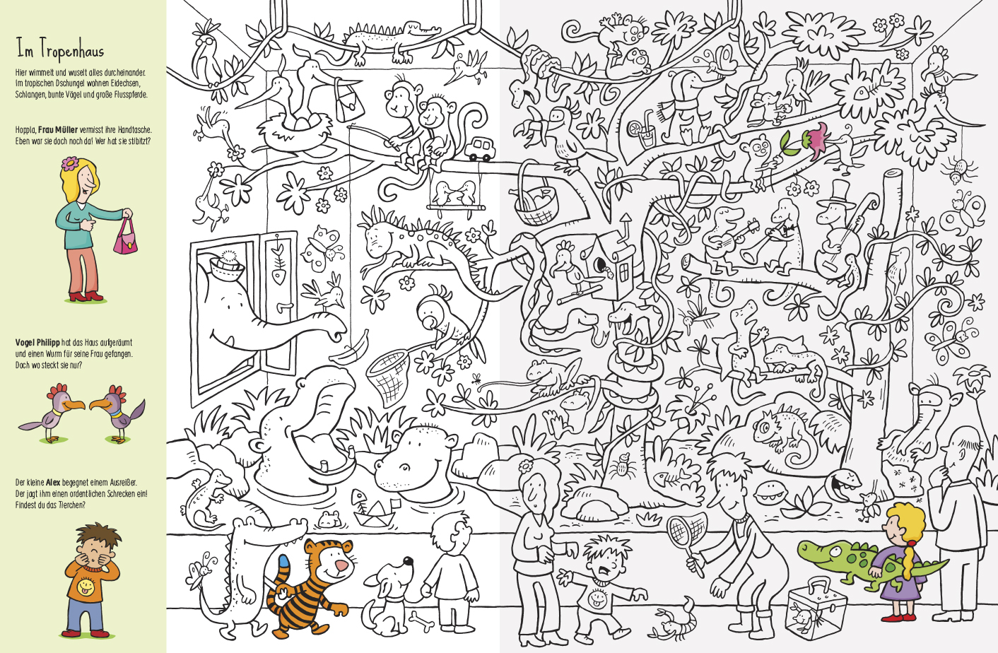 Tobi Tiger mit seiner lustigen blauen Schwanzspitze lebt mit vielen anderen Tieren im Zoo. Ob im Raubtierhaus, im Streichelzoo oder im Tropenhaus: An manchen Tagen haben die Tiere nichts als Unsinn im Kopf. Dann spielen sie sich gegenseitig Streiche, aber auch die Zoobesucher bleiben nicht verschont ... Auf jeder Seite müssen lustige Suchaufgaben geknackt werden. Und noch mehr Überraschungen gibt es beim Ausmalen! - Das Buch ist für alle Stifte geeignet und liegt beim Malen immer plan auf dem Tisch auf!
