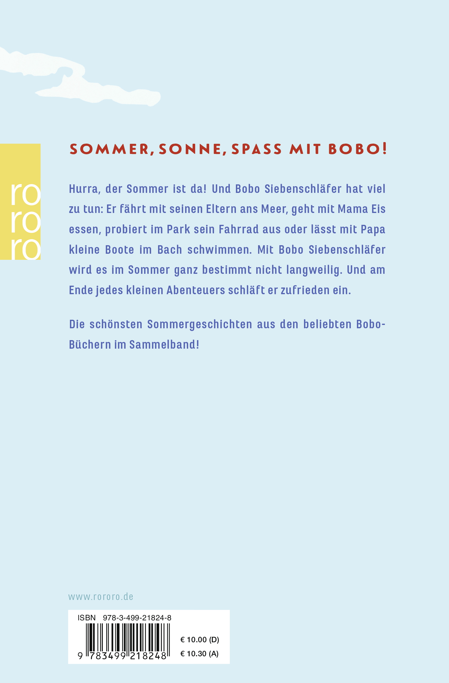 Hurra, der Sommer ist da! Und Bobo Siebenschläfer hat viel zu tun: Er fährt mit seinen Eltern ans Meer, geht mit Mama Eis essen, probiert im Park sein Fahrrad aus oder lässt mit Papa kleine Boote im Bach schwimmen. Mit Bobo Siebenschläfer wird es im Sommer ganz bestimmt nicht langweilig. Und am Ende jedes kleinen Abenteuers schläft er zufrieden ein.