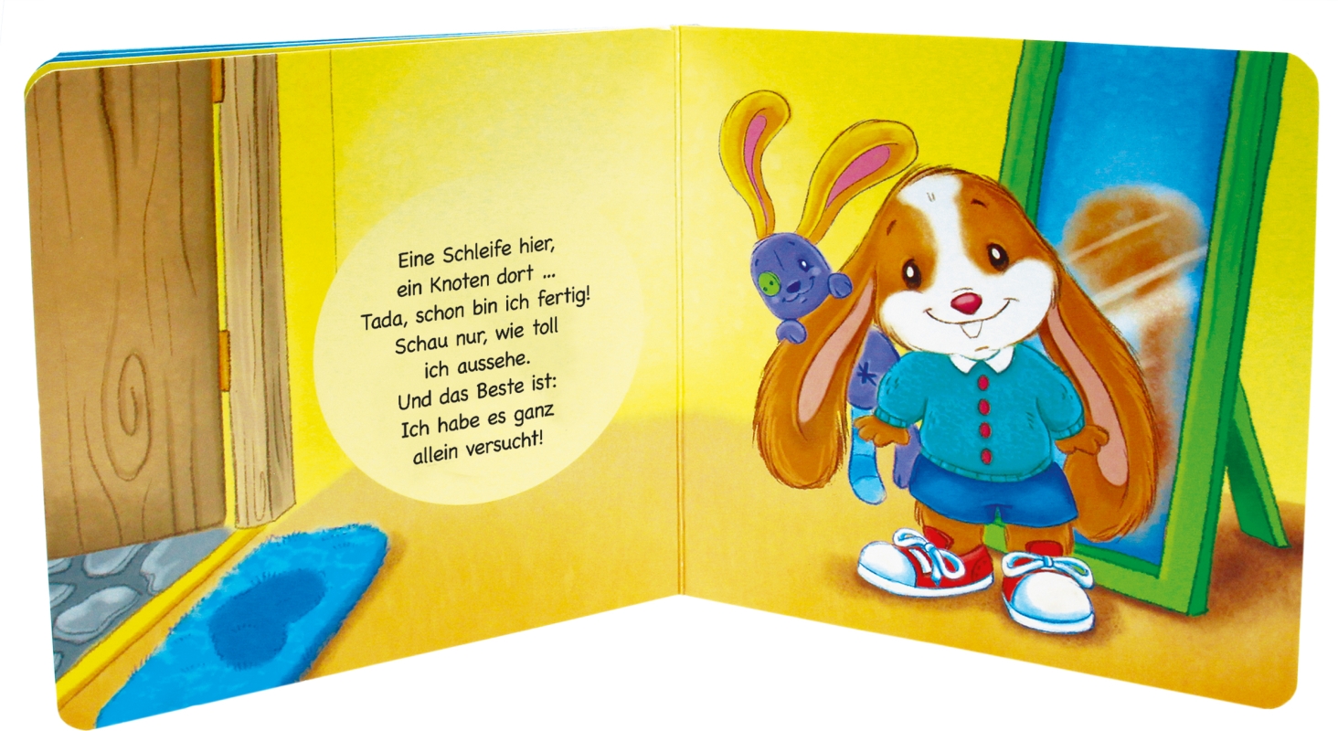 Große Schritte stehen an im Leben des kleinen Häschens! Die ersten Schritte sich alleine anzuziehen, motivieren auch kleine Menschenkinder.