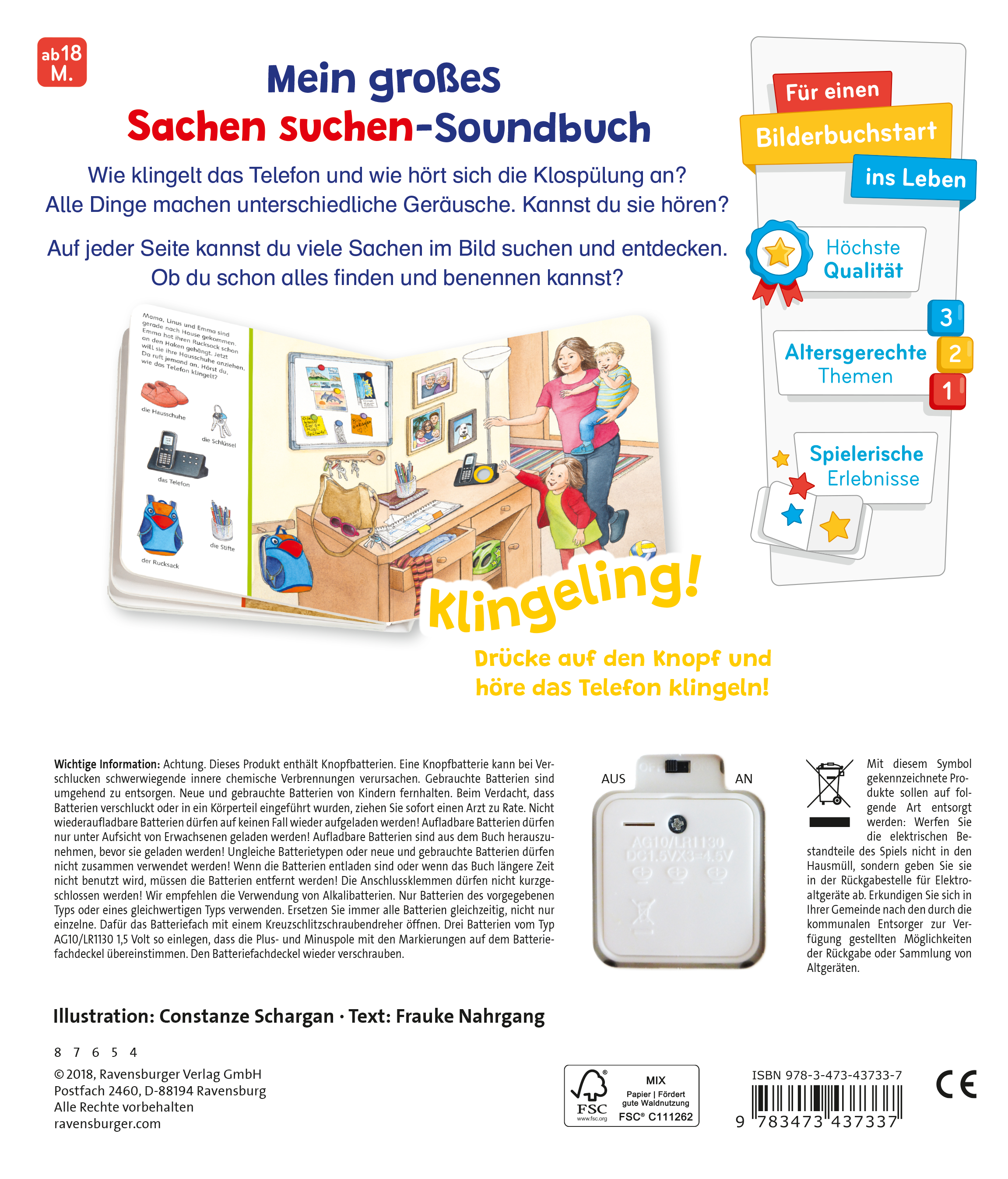 Das Soundbuch enthält folgende Szenen und Geräusche aus dem Kinderalltag:-Die Kinder spielen mit Opa draußen vor dem Haus. Linus drückt die Hupe des Rutschautos.-Emma und Linus dürfen Papa in der Küche helfen. Papa schalten den Handmixer an.-Im Hausflur klingelt das Telefon.-Linus und Emma sind mit Mama im Supermarkt und staunen über das Piepsen der Scannerkasse.-Nach dem Baden hilft Papa Linus beim Zähneputzen, Emma drückt die Klospülung.Die Lautstärke der Geräusche ist an das empfindliche Gehör von Kleinkindern angepasst. Zusätzlich lässt sich die Soundfunktion auf der Rückseite des Buches an- und ausschalten.Das Buch ist sofort einsatzbereit - es enthält drei für Kinder nicht zugängliche Knopfbatterien, die bei Bedarf nur mit Hilfe eines Kreuzschraubendrehers ausgetauscht werden können.