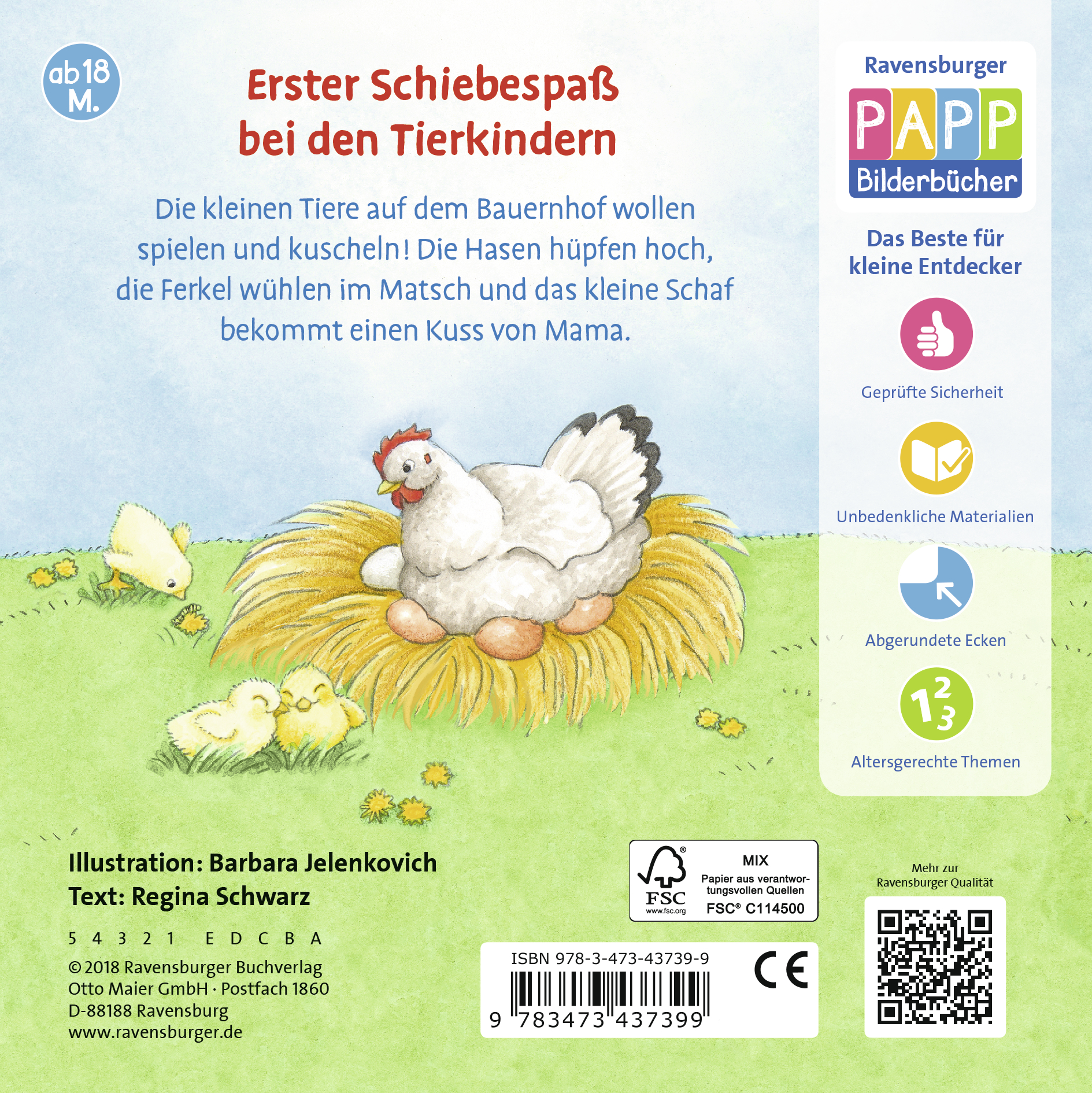 Die Tierkinder vom Bauernhof wollen kuscheln und spielen. Die Ferkel wühlen im Matsch, die Häschen hopsen herum und das Lamm bekommt einen Kuss. Mit vielen stabilen Schiebern erwecken Kinder die Tiere zum Leben.