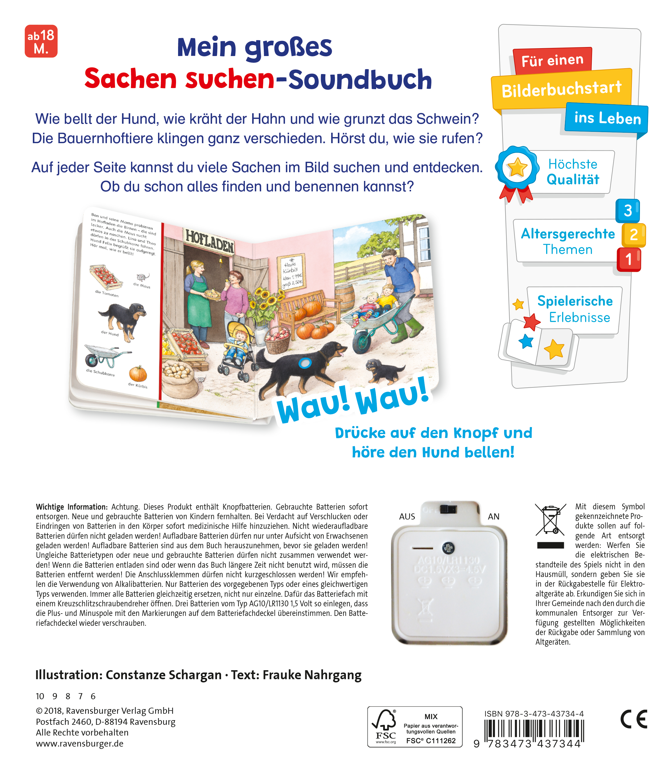 Das Soundbuch enthält folgende Bauernhof-Szenen und Geräusche:-Auf der Weide passt Kuh Elsa auf ihre Kälbchen auf und muht.-Vor dem Hofladen begrüßt Hund Felix bellend die Kinder Lina und Theo. -Im Stall grunzt das Schwein vergnügt mit seinen Ferkeln.-Vor dem Hühnerstall kräht der Hahn und freut sich über sein Futter.-Auf dem Feld tuckert der Traktor.Die Lautstärke der Geräusche ist an das empfindliche Gehör von Kleinkindern angepasst. Zusätzlich lässt sich die Soundfunktion auf der Rückseite des Buches an- und ausschalten.Das Buch ist sofort einsatzbereit - es enthält drei für Kinder nicht zugängliche Knopfbatterien, die bei Bedarf nur mit Hilfe eines Kreuzschraubendrehers ausgetauscht werden können.