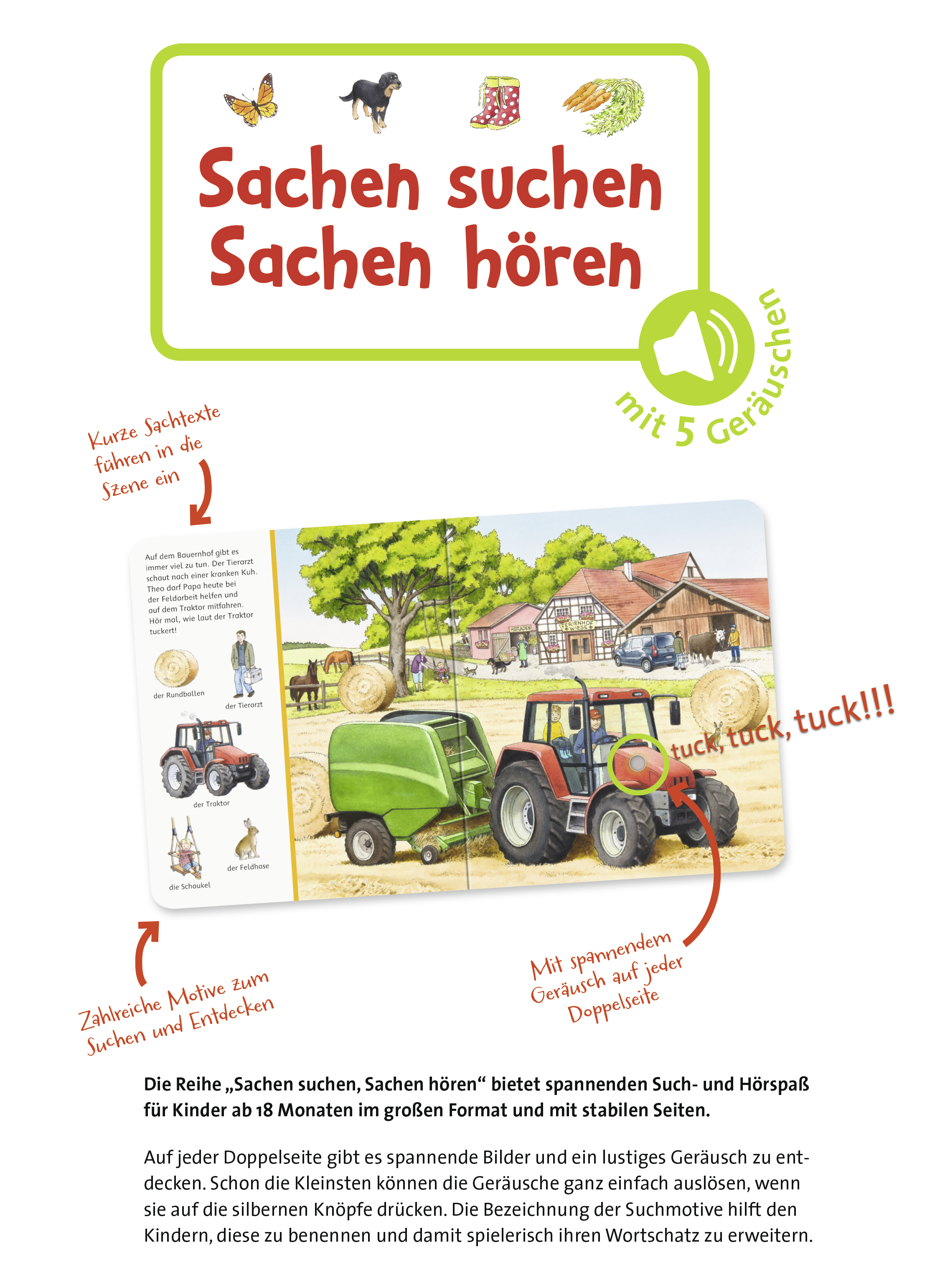Nanu, wer kräht denn da vor dem Hühnerstall? Und wie klingen Kuh, Schwein, Hund und Traktor? In jeder der fünf Bauernhof-Szenen können schon die Kleinsten auf den Knopf im Bild drücken und kinderleicht einen tollen Sound auslösen. Kurze Erzähltexte sind ideal zum Vorlesen geeignet und viele kleine Sachen suchen-Motive laden zum genauen Hinsehen und Wiederentdecken in den großen Suchbildern ein.