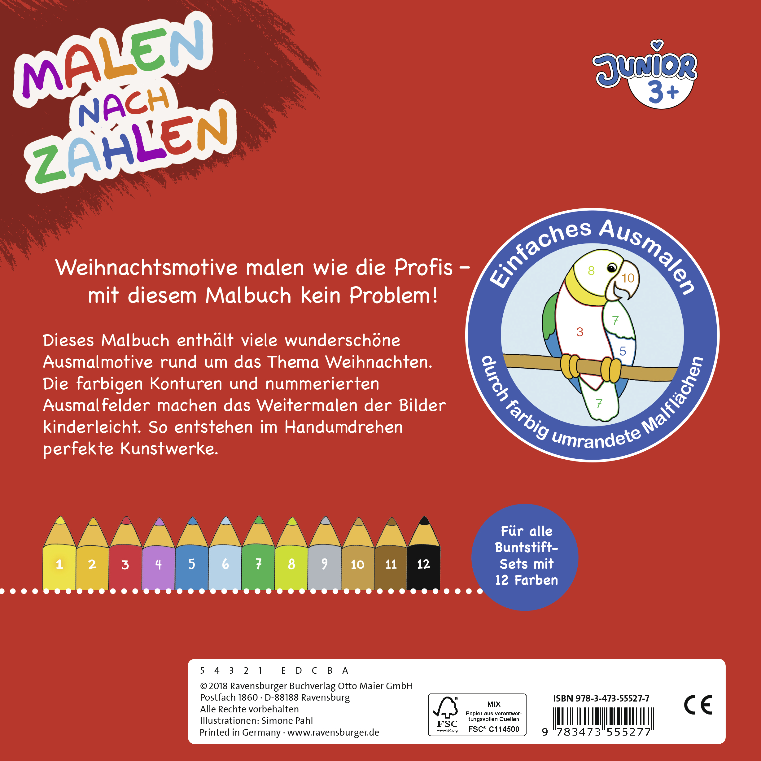Dieses Malbuch enthält viele altersgerechte weihnachtliche Ausmalmotive. Die farbigen Konturen und nummerierten Ausmalfeldern machen das Weitermalen der Bilder kinderleicht.