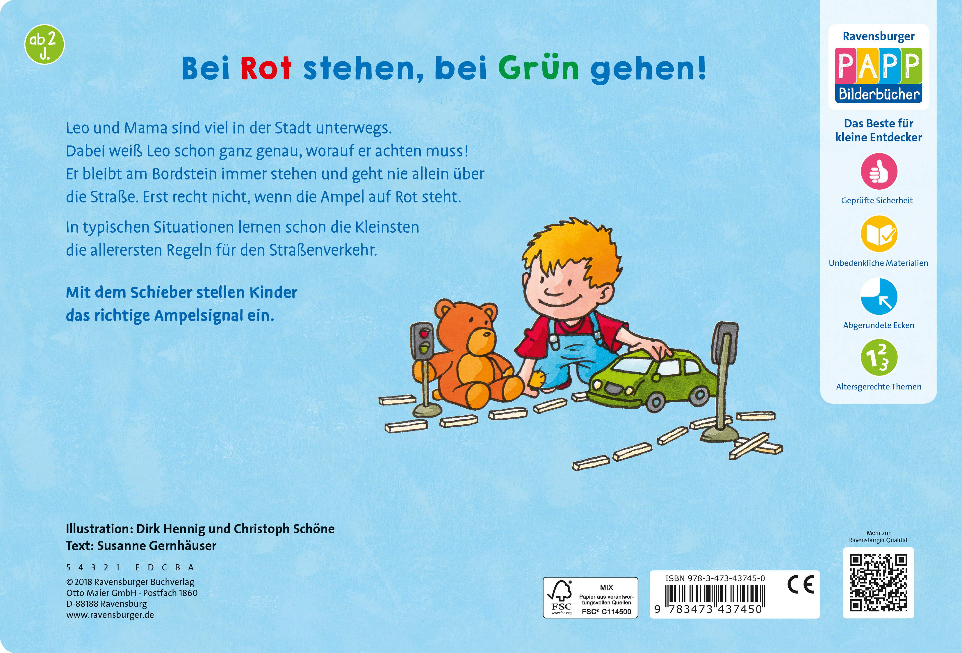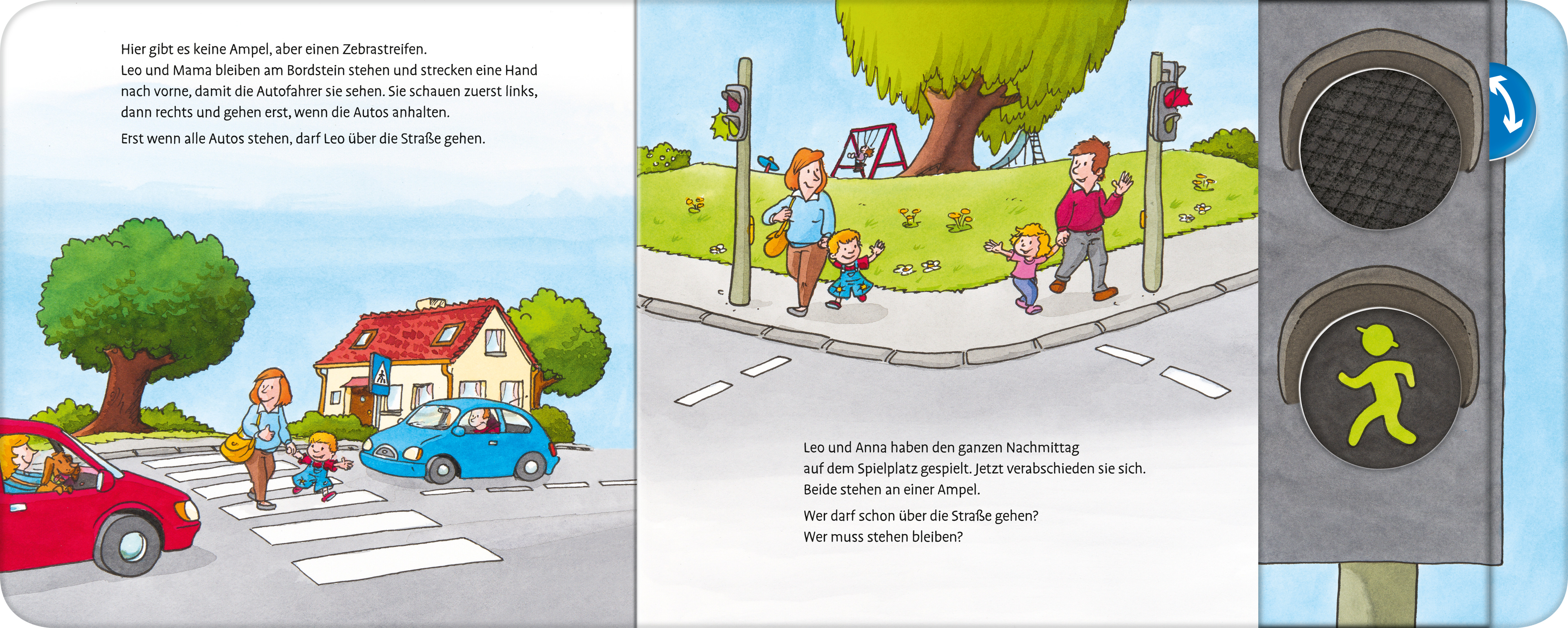 Mit großen Klappen, einfachen Merkreimen und lustigem Ampelschieber lernen die Kleinsten allererste Regeln für das Verhalten im Straßenverkehr: am Bordstein anhalten, bei Rot immer stehen bleiben und nie allein über die Straße gehen.