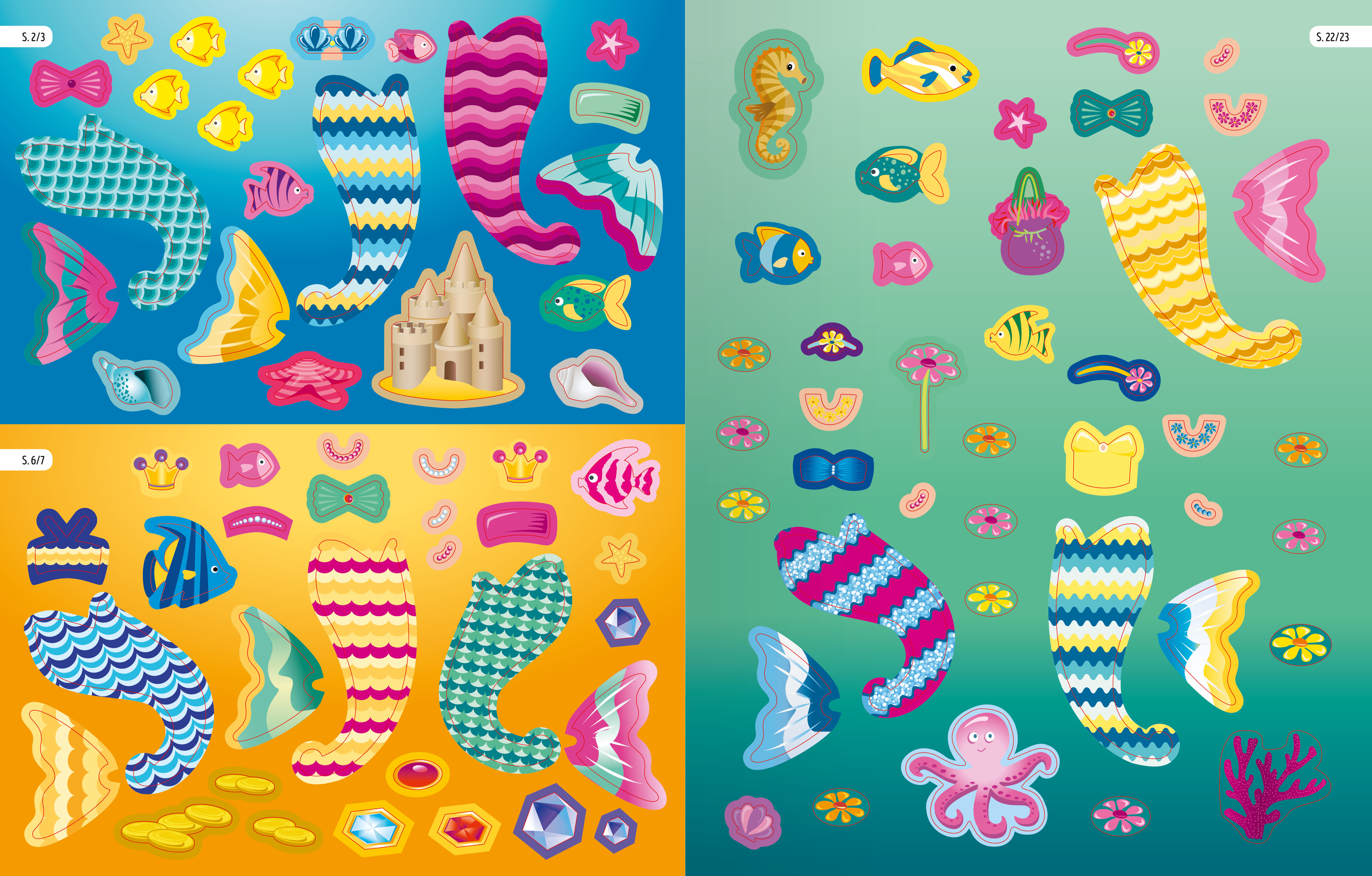 Mit über 300 farbigen Stickern können die Unterwasser-Szenen gestaltet sowie die Anziehpuppen ganz nach Lust und Laune eingekleidet werden.