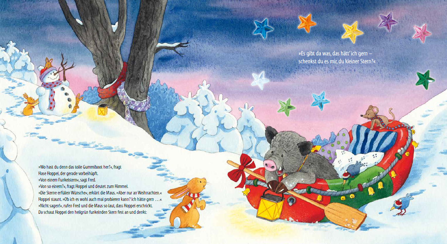 Wenn Weihnachtssterne am Himmel erscheinen und man sich etwas ganz fest wünscht, gehen diese Wünsche in Erfüllung – heißt es. Aber ob das stimmt? Wildschwein Fred und seine Freunde wollen es auf jeden Fall versuchen. Ein Bilderbuchs für Kinder ab 4 Jahren.