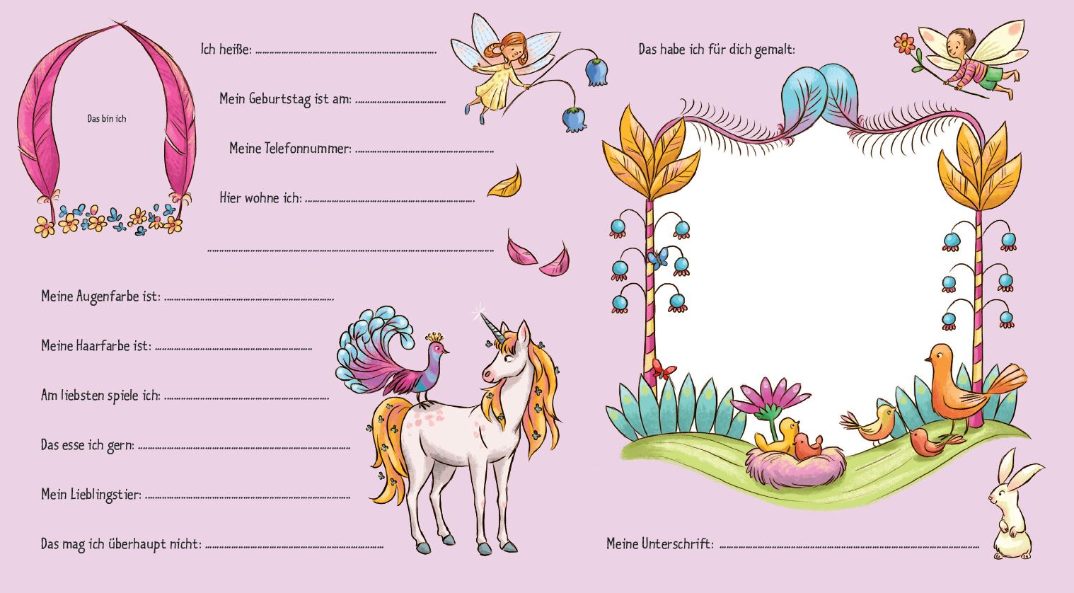 Für alle kleinen Feen, Elfen und Einhornfreundinnen gibt es hier die perfekte Seite zum Eintragen. Was ist euer Lieblingsessen? Was mögt ihr überhaupt nicht? Und was spielt ihr am liebsten? Dieses magische Freundealbum bietet viel Platz für Fotos und zum Malen eigener kleiner Kunstwerke. Das Papier ist für Filzstifte und Wasserfarben geeignet.