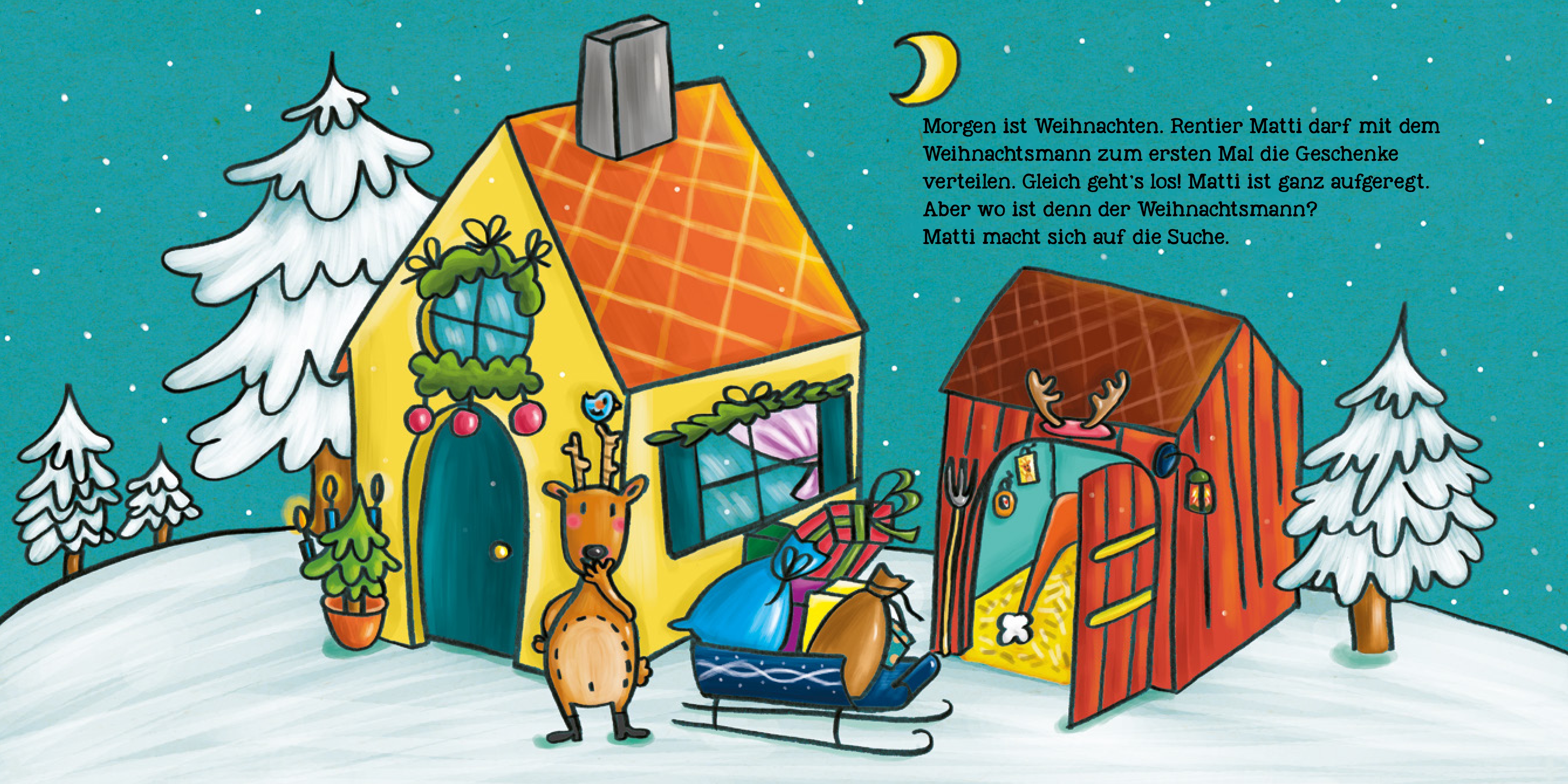 Ein kleines Rentier zum Verlieben. Rentier Matti ist sehr aufgeregt: Zum ersten Mal darf er mit dem Weihnachtsmann die Geschenke verteilen. Aber, wo ist der Weihnachtsmann? Matti sucht bei den Hasen, die gerade Plätzchen backen, beim Bären und bei den bastelnden Eichhörnchen. Der Weihnachtsmann ist nirgends zu sehen. Traurig läuft Matti zurück zum Rentierstall. Oh, wer wartet da? Der Weihnachtsmann! Mit einem kleinen Geschenk steht er vor einem erleuchteten Weihnachtsbaum im Rentierstall. Jetzt muss Weihnachten doch nicht ausfallen. Warmherzig geschrieben und modern illustriert führt diese Geschichte die Jüngsten an Weihnachtsrituale heran.