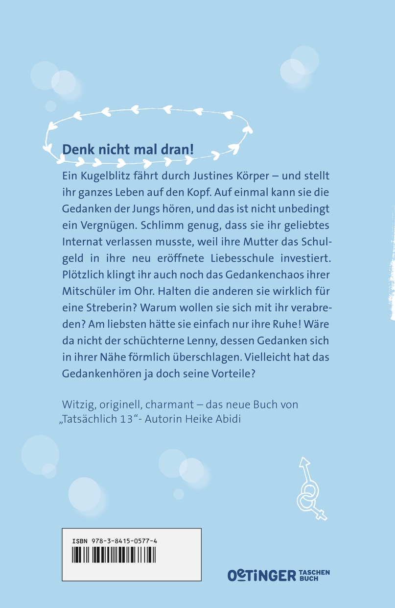 Justines Leben wird gleich in mehrfacher Hinsicht auf den Kopf gestellt: Erst muss sie ihr geliebtes Internat verlassen und eine normale Schule besuchen - ohne Hockeyteam, Debattierclub und Flötenklasse. Dann erwischt sie eines Abends im Garten ein Kugelblitz, der sie kurzfristig völlig außer Gefecht setzt. Als sie wieder zu sich kommt, scheint erst einmal alles normal, bis sie am nächsten Tag in der Schule merkt, dass es nun alles andere als normal ist. Denn Justine kann auf einmal die Gedanken der Jungs lesen. Zumindest, wenn sie sich um Gefühle drehen. Das sorgt für einige erhellende Erkenntnisse, allerdings auch für ziemliches Gefühlschaos. Denn da gibt es Lenny, der ganz schön süß ist und dessen Gedanken sich förmlich überschlagen, wenn er in Justines Nähe ist. Bis sie schließlich ganz verstummen ...