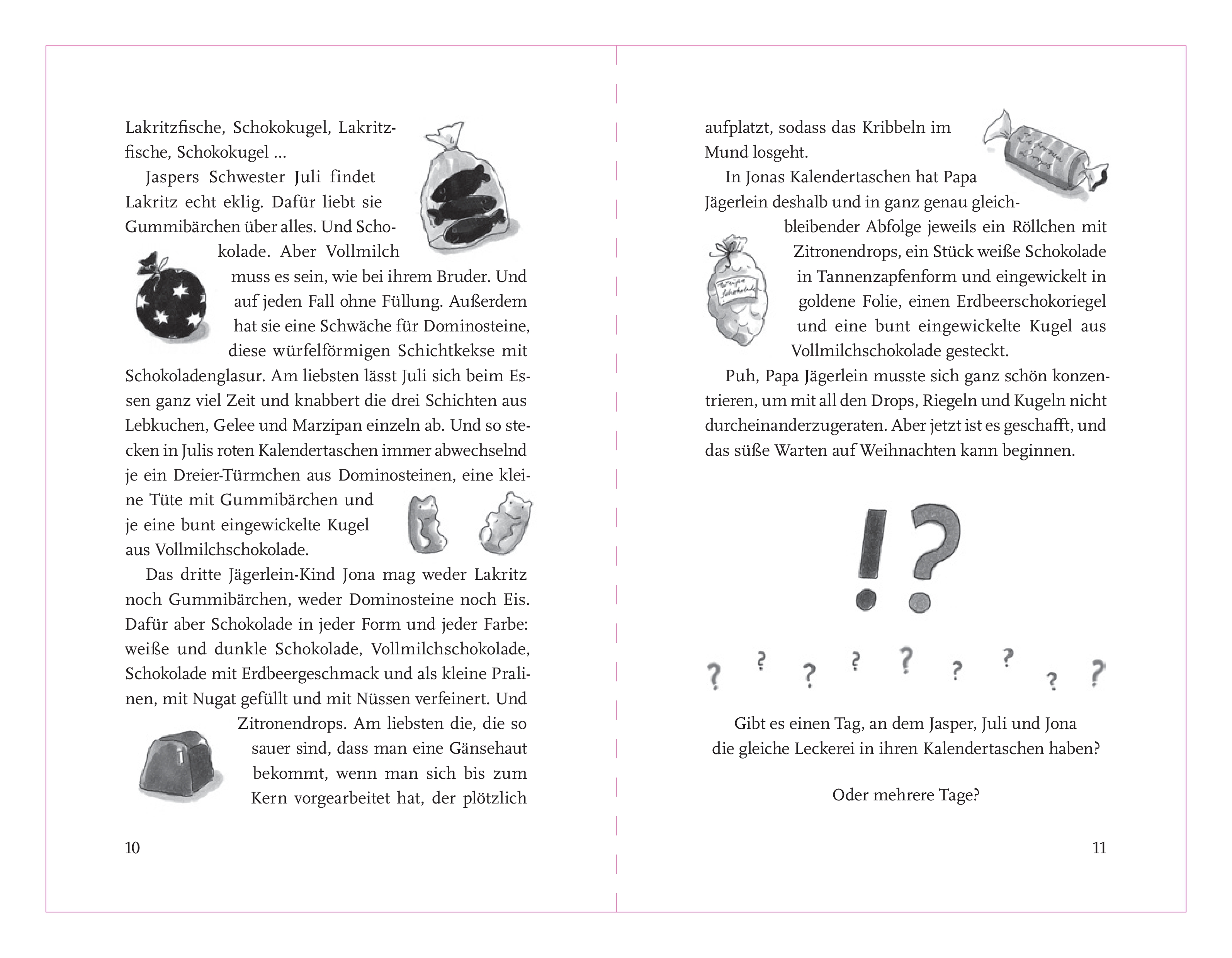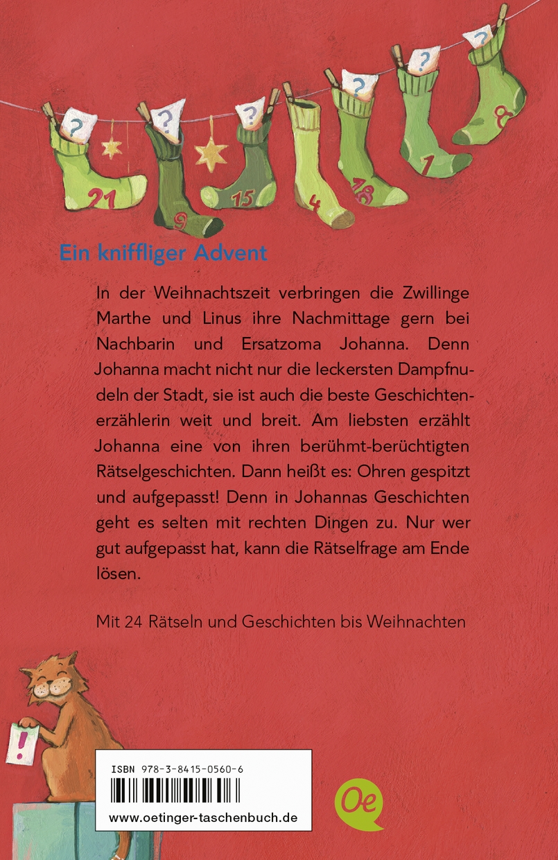 In der Weihnachtszeit verbringen die Zwillinge Marthe und Linus ihre Nachmittage gern bei Nachbarin und Ersatzoma Johanna. Denn Johanna macht nicht nur die leckersten Dampfnudeln der Stadt, sie ist auch die beste Geschichtenerzählerin weit und breit. Am liebsten erzählt Johanna eine von ihren berühmt-berüchtigten Rätselgeschichten. Dann heißt es: Ohren gespitzt und aufgepasst! Denn in Johannas Geschichten geht es selten mit rechten Dingen zu. Nur wer gut aufgepasst hat, kann die Rätselfrage am Ende einer jeden Geschichte lösen.