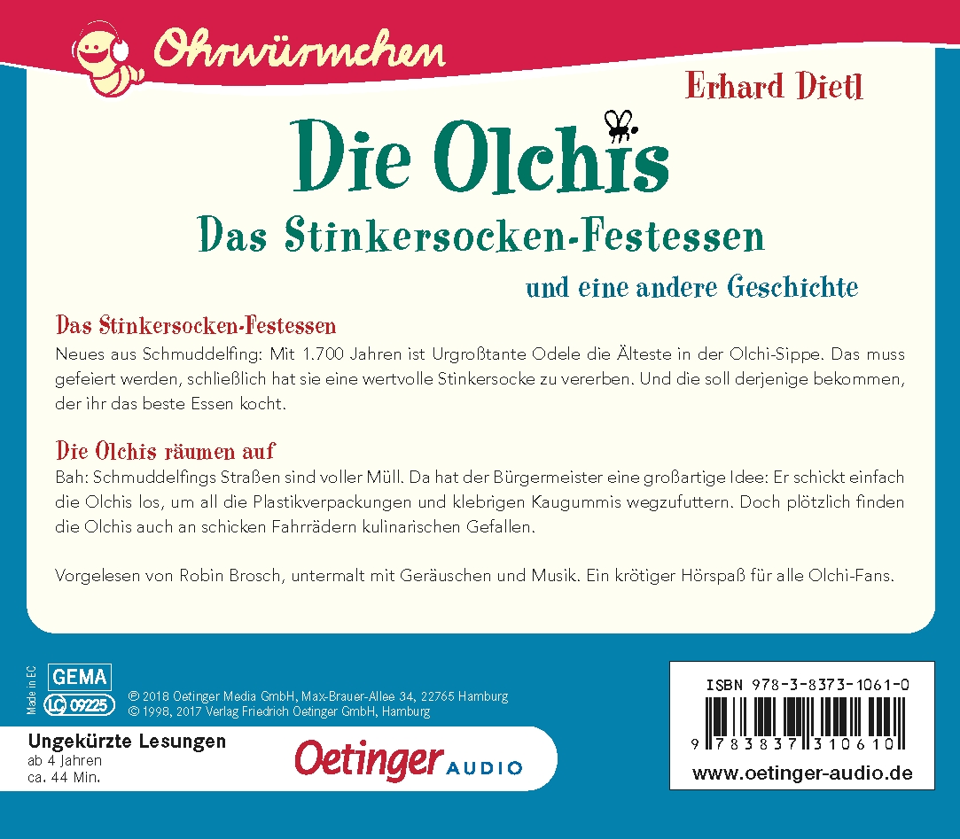 Enthält die Geschichten "Das große Stinkersocken-Festessen" und "Die Olchis räumen auf." Ungekürzte Lesungen mit Geräuschen und Musik. Ein krötiger Hörspaß für alle Olchi-Fans.