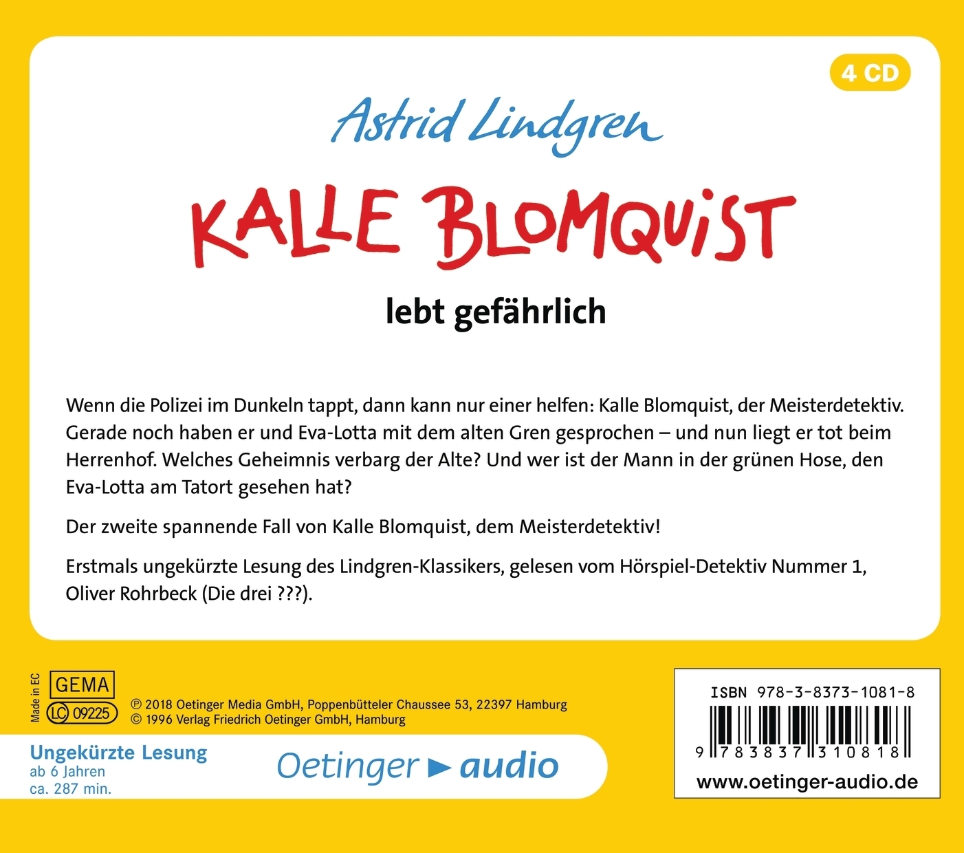 Ungekürzte Lesung, ca. 240 Minuten Der zweite spannende Fall von Kalle Blomquist, dem Meisterdetektiv: Wenn die Polizei im Dunkeln tappt, kann nur einer helfen: Kalle Blomquist, der Meisterdetektiv aus der Feder von Astrid Lindgren. Gerade noch haben er und Eva-Lotta mit dem alten Gren gesprochen - und nun liegt er tot beim Herrenhof. Welches Geheimnis verbarg der Alte? Und wer ist der Mann in der grünen Hose, den Eva-Lotta am Tatort gesehen hat? Der zweite Fall des Meisterdetektivs Kalle Blomquist vom Meisterdetektiv Oliver Rohrbeck (Die drei ???) gelesen.