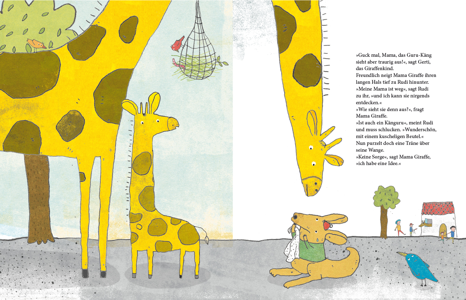 Rudi erinnert sich an Mamas Spruch: »KANNST DU MICH MAL NICHT MEHR SEHEN, HÜPF NICHT WEITER, BLEIBE STEHEN!« Zu Rudis Glück hilft ihm die Giraffenmama an Ort und Stelle und seine Mutter ist schnell wieder gefunden. So geht der Zoobesuch doch noch glücklich zu Ende!