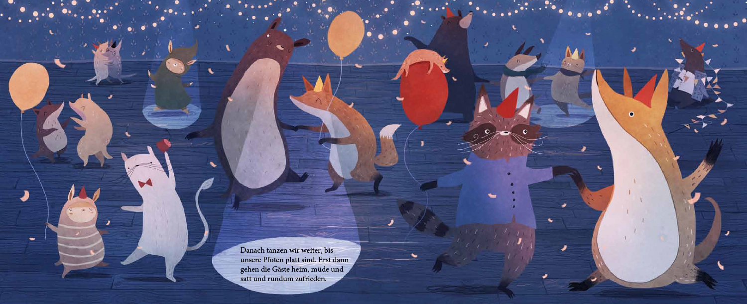Eines Morgens wacht der Fuchs auf und vermisst seine Freunde. Da hat er die beste Idee überhaupt: Er lädt alle zu einer Party ein! Nur leider geht bei den Vorbereitungen einiges schief, und schwups, stehen die Gäste schon vor der Tür, noch ehe er fertig ist. Als mitten im schönsten Feiern alle Hunger bekommen, zeigt sich, dass wahre Freunde gemeinsam durch dick und dünn gehen: Alle zusammen backen sie einen riesigen Berg Pfannkuchen, so dass bis zum Morgengrauen gemampft und gefeiert werden kann!