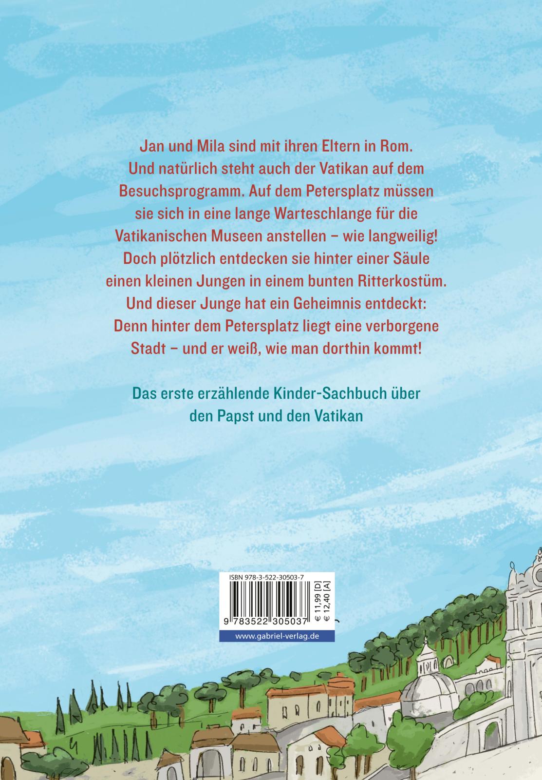 Jan und Mila sind mit ihren Eltern in Rom. Und natürlich steht auch der Vatikan auf dem Besuchsprogramm. Auf dem Petersplatz müssen sie sich in eine lange Warteschlange für die Vatikanischen Museen anstellen - wie langweilig! Doch plötzlich entdecken sie hinter einer Säule einen kleinen Jungen in einem bunten Ritterkostüm. Und dieser Junge hat ein Geheimnis entdeckt: Denn hinter dem Petersplatz liegt eine verborgene Stadt - und er weiß, wie man dorthin kommt!