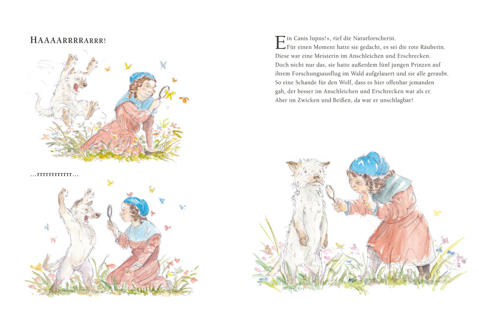 "Wieder einmal hat Meschenmoser mit Stift, Aquarellfarben und viel augenzwinkerndem Humor die Wolfsfigur der Brüder Grimm uminterpretiert und in neues Licht gestellt."